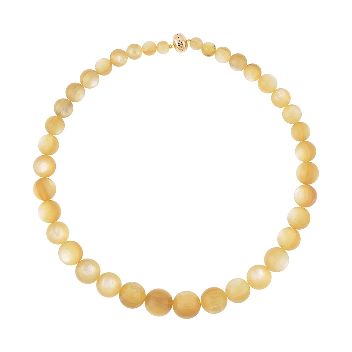 Enhance your jewelry collection with this exquisite golden lepidolite beaded necklace. The striking golden tones of the lepidolite beads add a touch of glamour to any outfit. This beaded necklace is a must-have with this 14K yellow gold magnetic lock. Elevate your style with this stunning piece today!