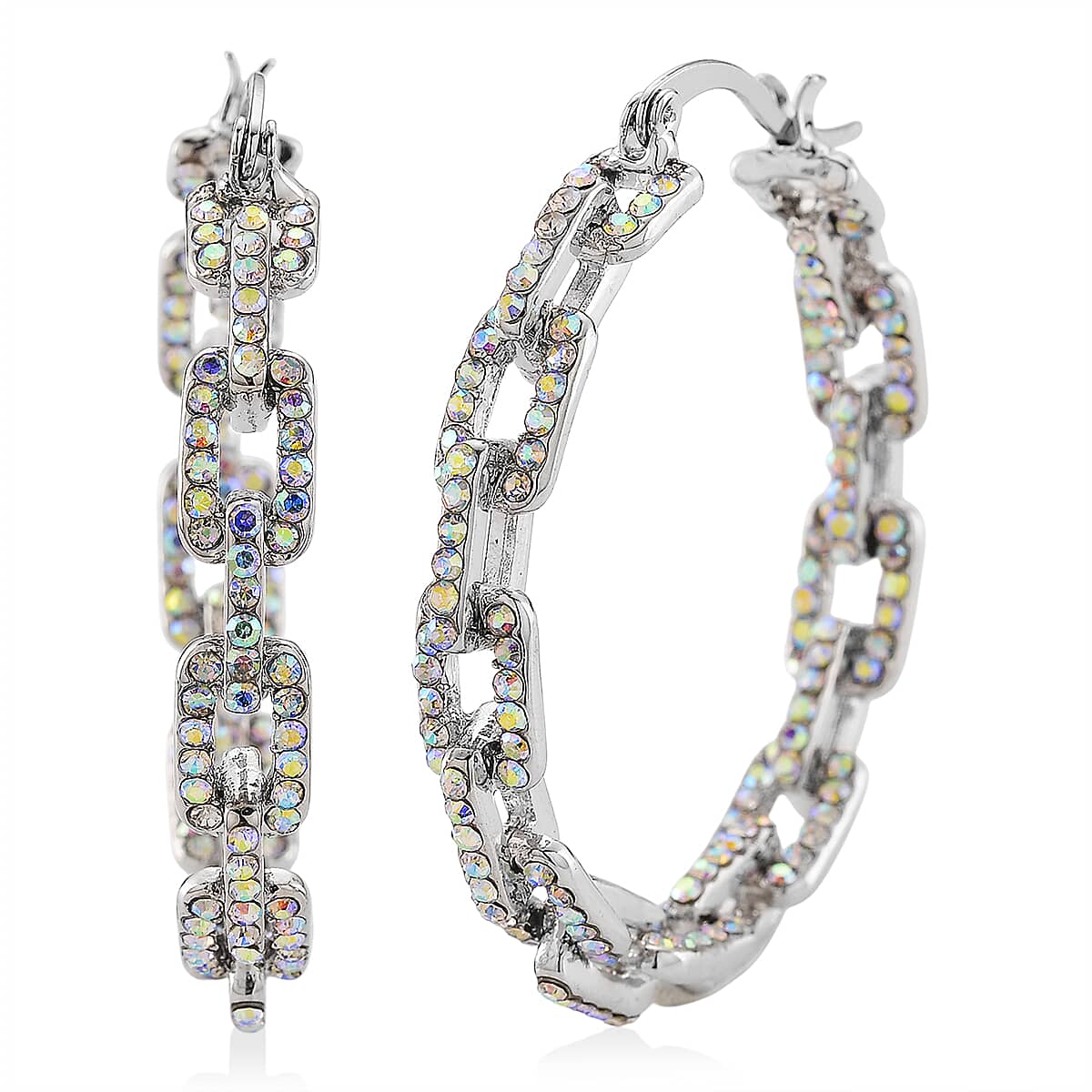 Simulated Mystic White Crystal Paper Clip Hoop Earrings in Silvertone
