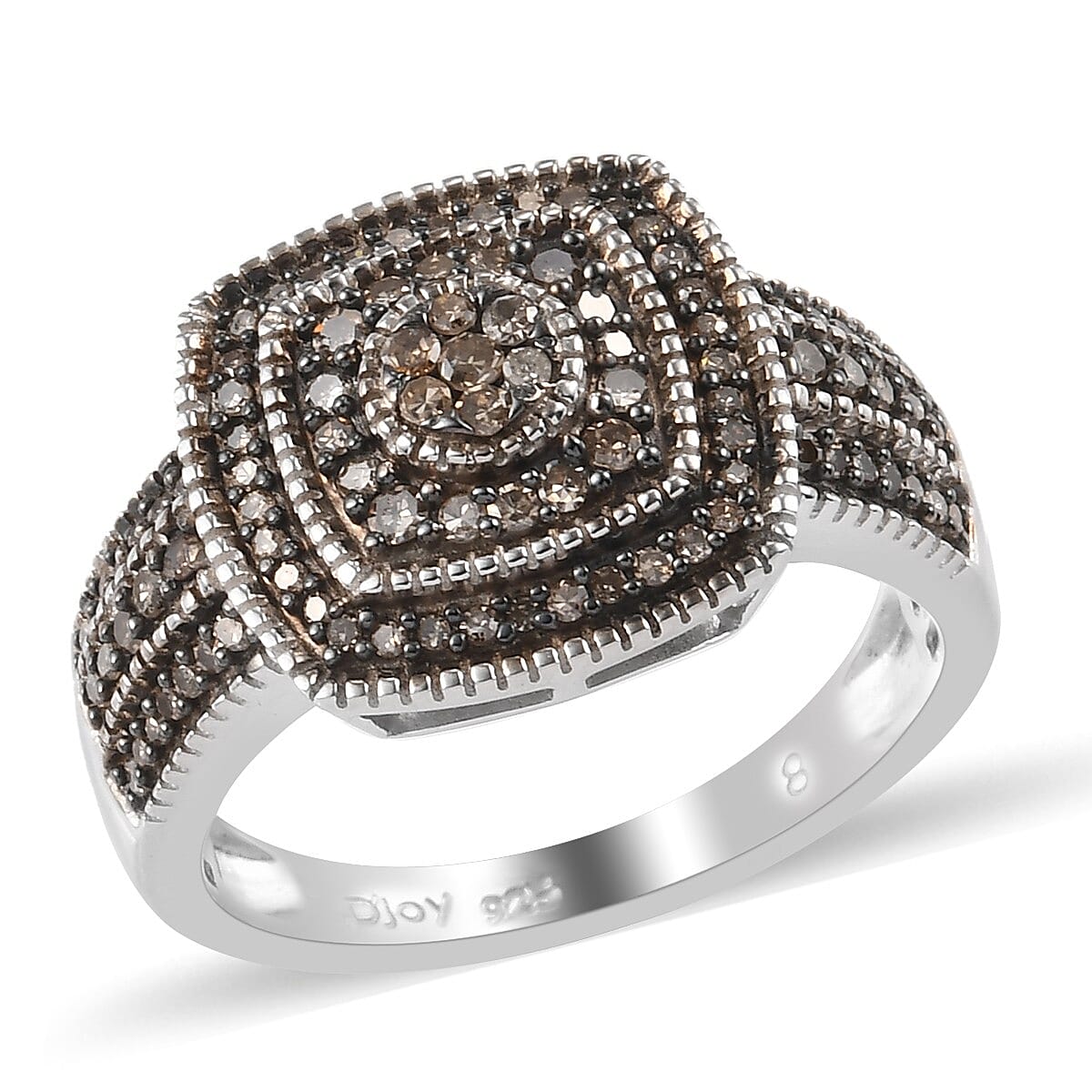 Inspired by art deco, this natural champagne diamond ring symbolizes style and grace. The design of this ring features a square stacked in a square studded with diamonds. The cluster of round-shaped gems in the center gives a denser luxurious appearance. The metal pattern segregates each row of diamonds giving a clean look to the piece. Champagne diamonds have a wine sparkling hue, and the perfect hardness of this gem makes this ring suitable for everyday wear. Colored diamonds are in trend for their distinctive look in comparison to white diamonds. This sterling silver crafted ring suits every outfit.