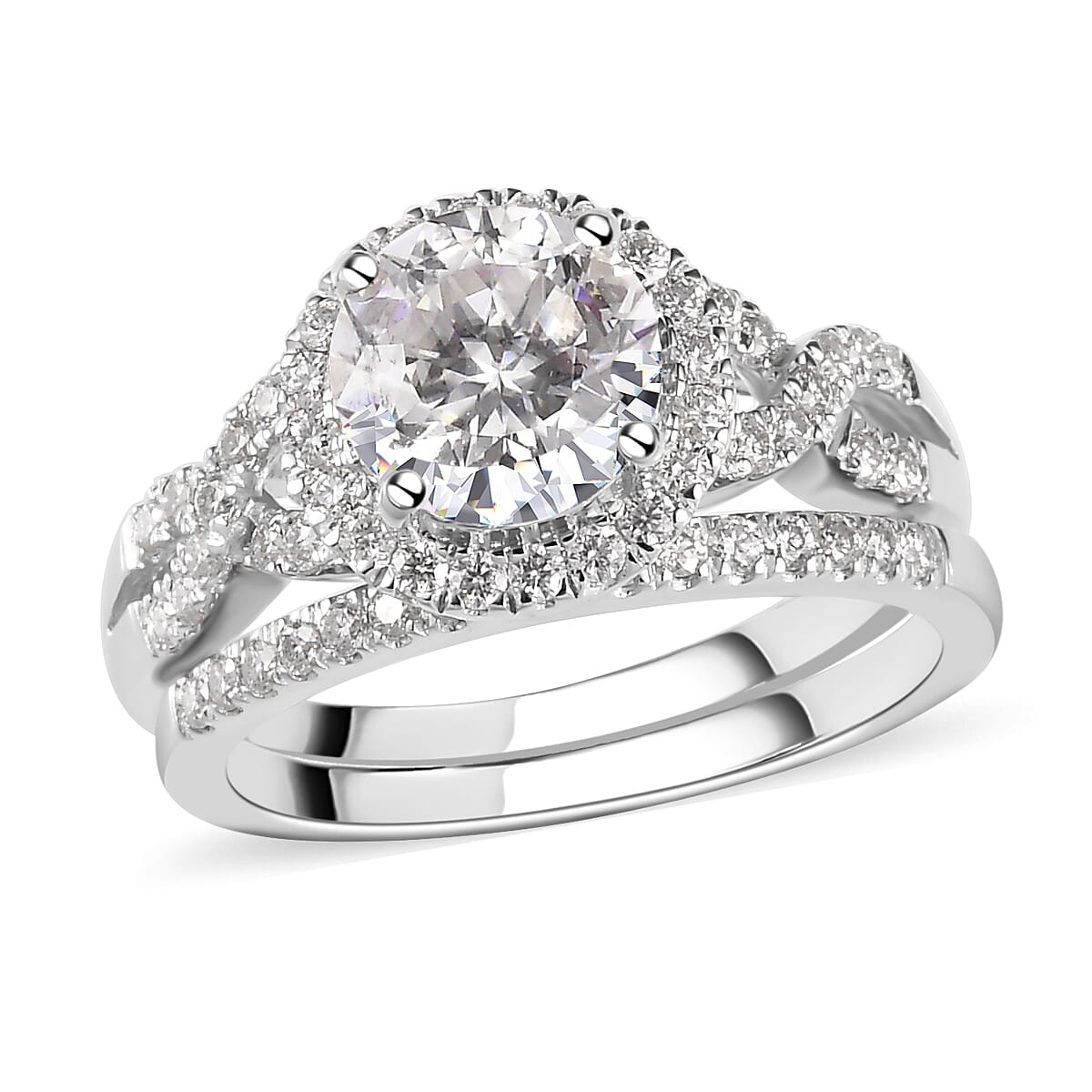 100 Facet Moissanite Bridal Set of 2 Ring in Platinum Over Sterling Silver (Size 5.0) 2.65 ctw
