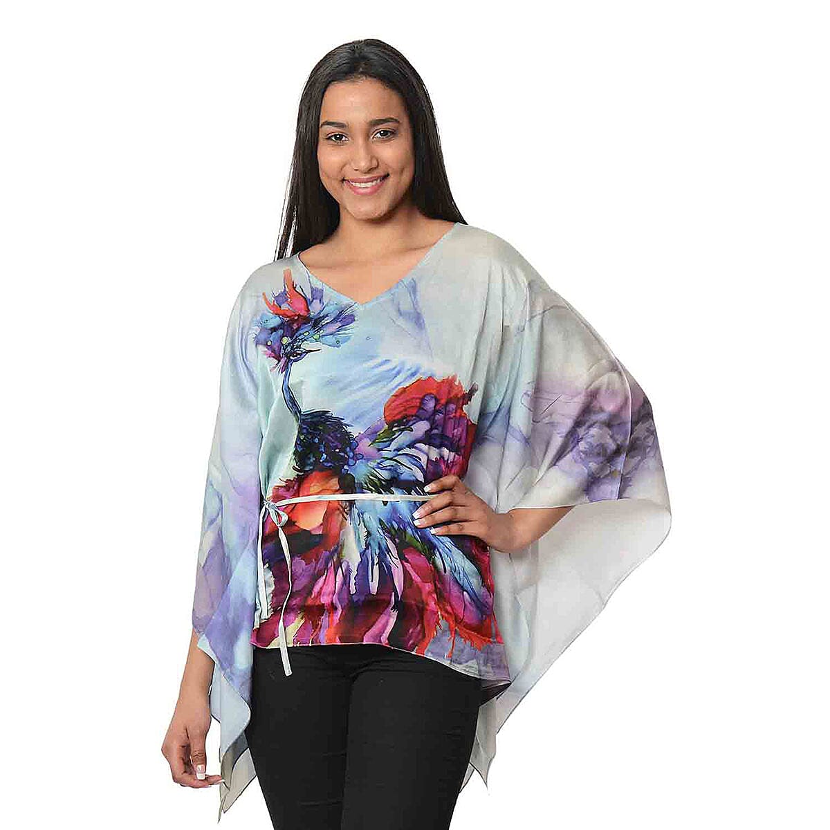 100% Mulberry Silk Blue Peacock Digitally Printed Kaftan with Waist Belt (XXL/XXXL)