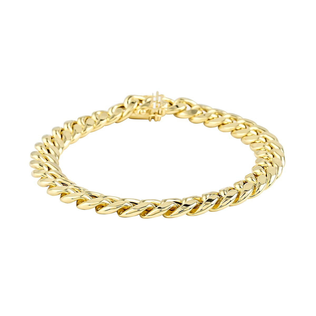 This yellow-gold Miami Cuban bracelet will shine brightly on your wrist. Inspired by the hip-hop culture that flourished in the 70s, this Miami bracelet is traditional jewelry. Two thick strands of gold are flattened and woven to design this classic jewelry. The strands are closely knit with links that feature an oval shape.  This yellow gold link jewelry gives an eye-catchy shimmer. This Miami Cuban link bracelet for women is gracefully crafted in 10K yellow gold. The metal frame is suitable for all skin types with a rich texture. This yellow gold bracelet for women gives a bold and dense look.