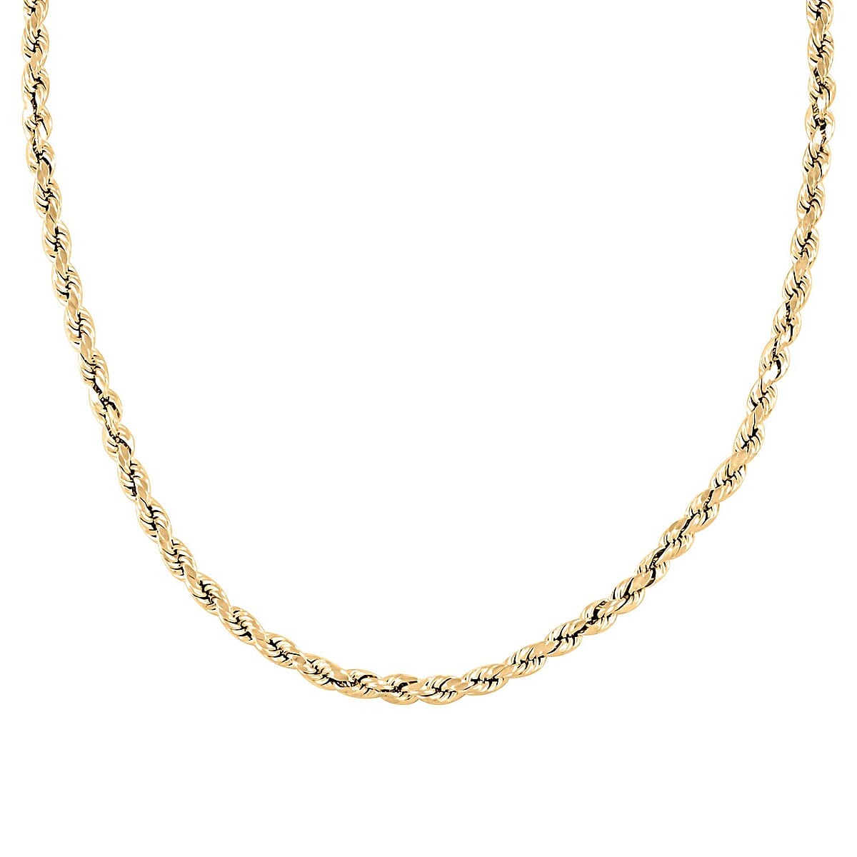 This 10K yellow gold rope chain necklace exudes classic elegance with its intricate design. The links are interwoven to create a rope-like appearance, while the twisted spiral pattern adds a textured and sophisticated look. This necklace shimmers attractively, enhancing its visual appeal.