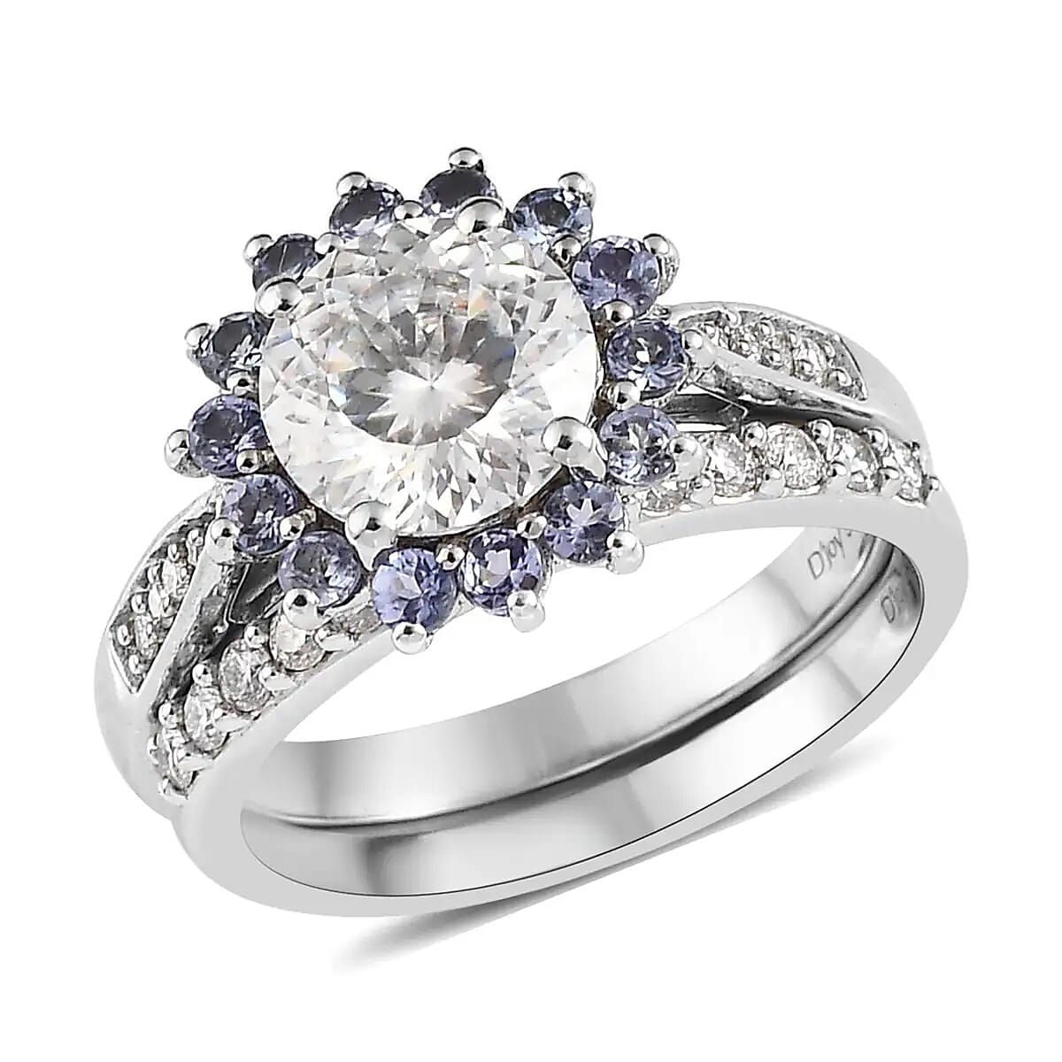 120 Facets Moissanite and Tanzanite Set of 2 Stackable Ring in Platinum Over Sterling Silver (Size 7.0) 3.00 ctw