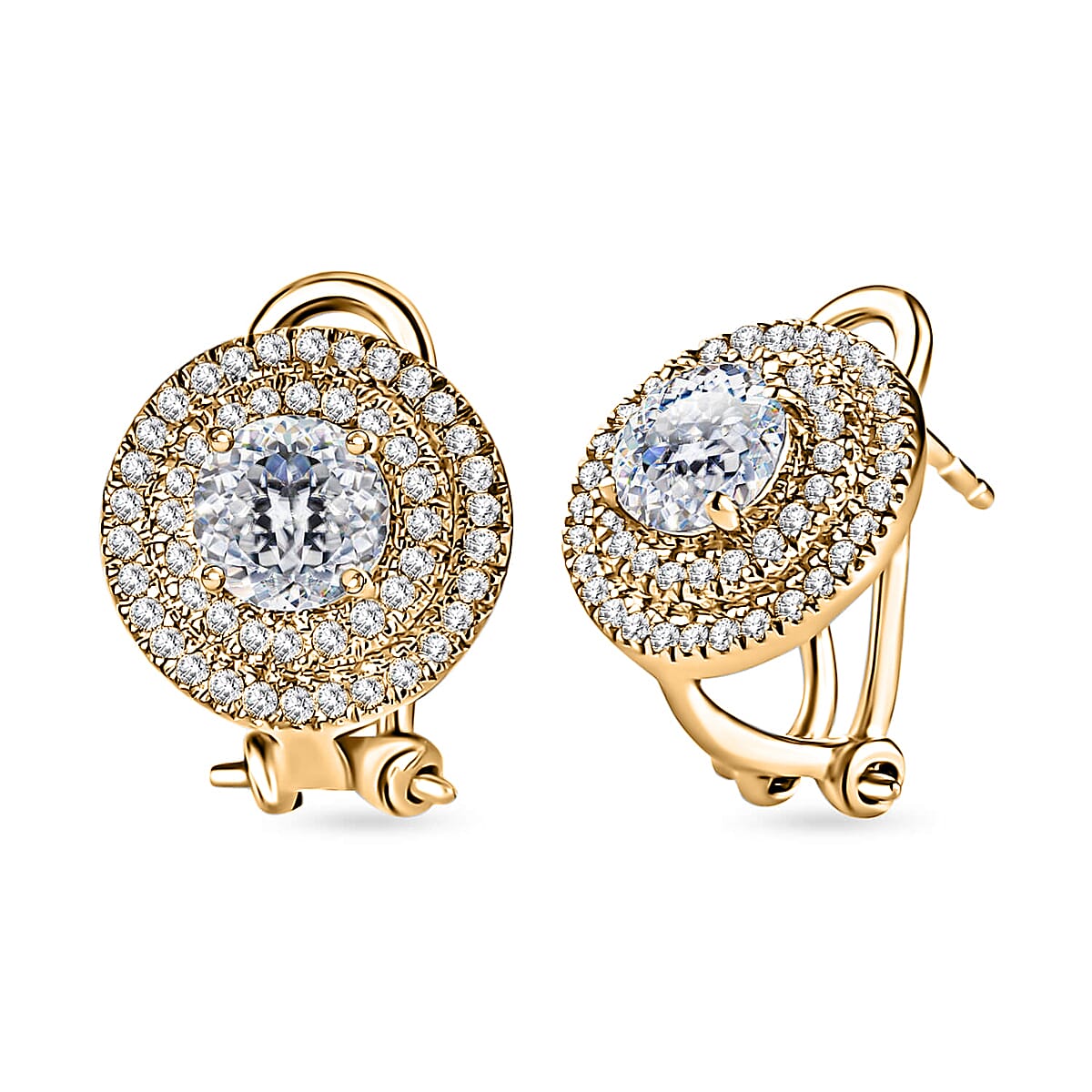 120 Facets Moissanite Earrings, Omega Clip Earrings, Vermeil Yellow Gold Over Sterling Silver Earrings, Double Halo Earrings, Moissanite Jewelry For Her, Gifts For Her 2.10 ctw