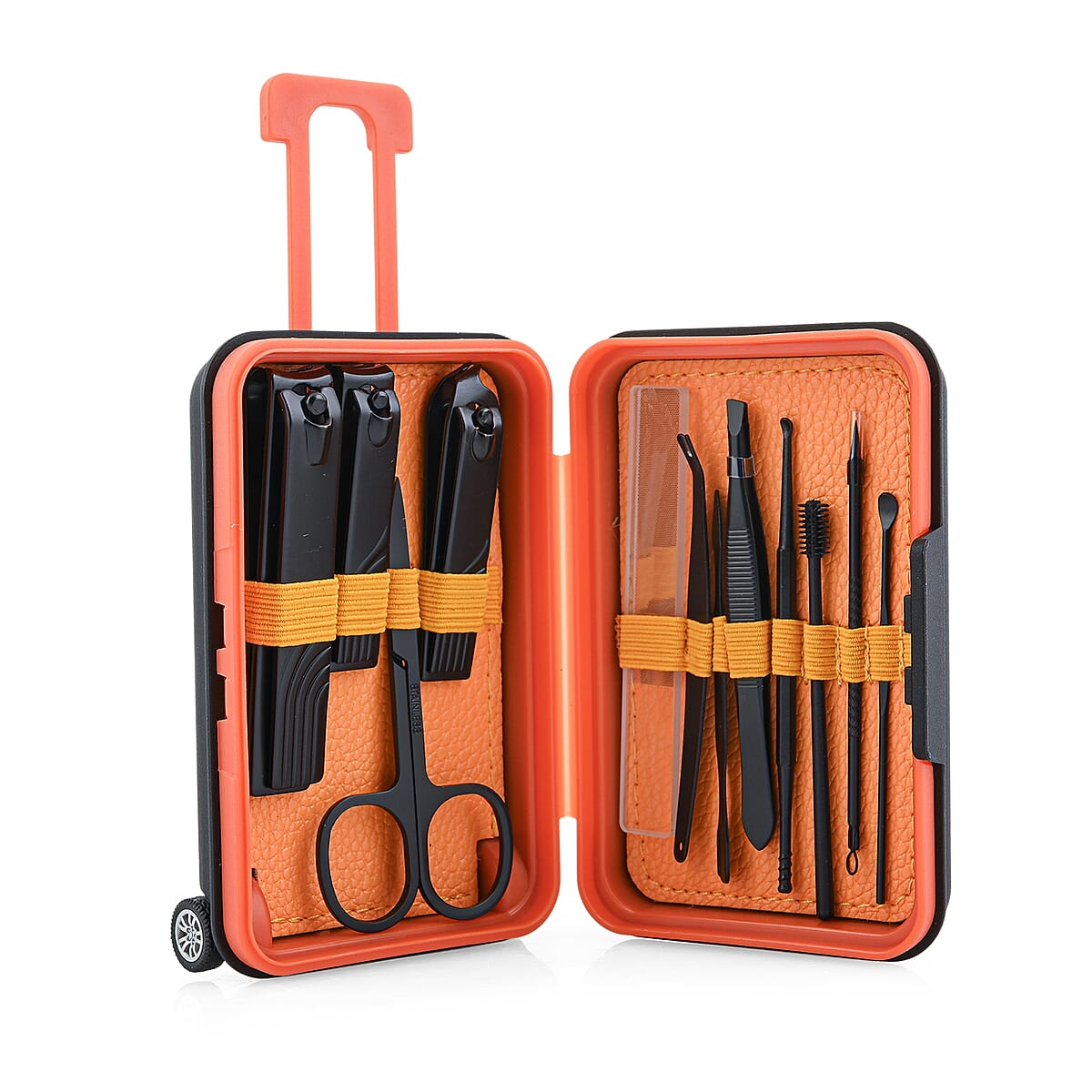 3 Nail Clippers, 1 Eyebrow Scissors, 1 Nail File, 1 Cuticle Pusher, 1 Double Ended Nail Pick, 1 Eyebrow Tweezer, 1 Double Ended Nose Hair Trimmer, 1 Silicone Ear Stick,1 Small Pimple Needle, 1 Ear Scoop |