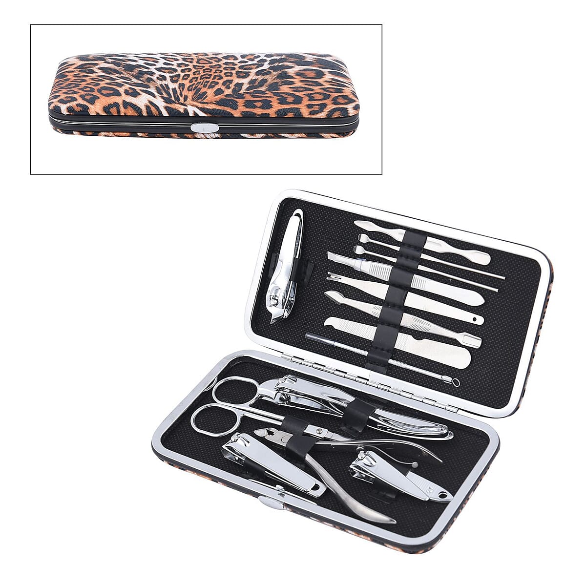 14 Piece Stainless Steel Manicure Grooming Kit in Brown Leopard Print Faux Leather Case