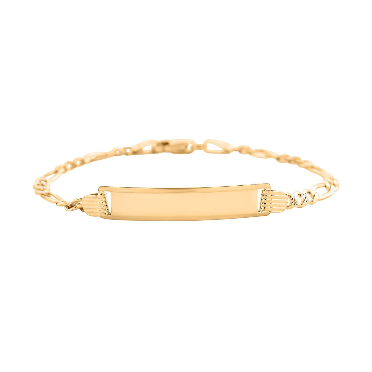 This stunning bracelet is crafted from high-quality 14K yellow and white gold. The unique Figaro chain design is adorned with white and yellow gold, adding a touch of luxury and elegance to this piece. The ID plate is perfect for engraving a name or special message, making this solid gold bracelet a thoughtful and personal gift.