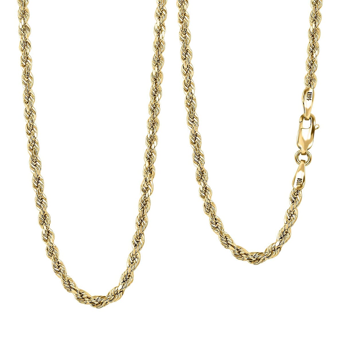 Indulge in the opulence of this 14K yellow gold rope necklace, a symbol of strength and unity. With its timeless design and versatile appeal, this unisex gold chain necklace is a must-have accessory. Secure it with the lobster clasp and let the radiant golden hue elevate your style to new heights. Discover the allure of this exquisite 14K yellow gold rope chain today.