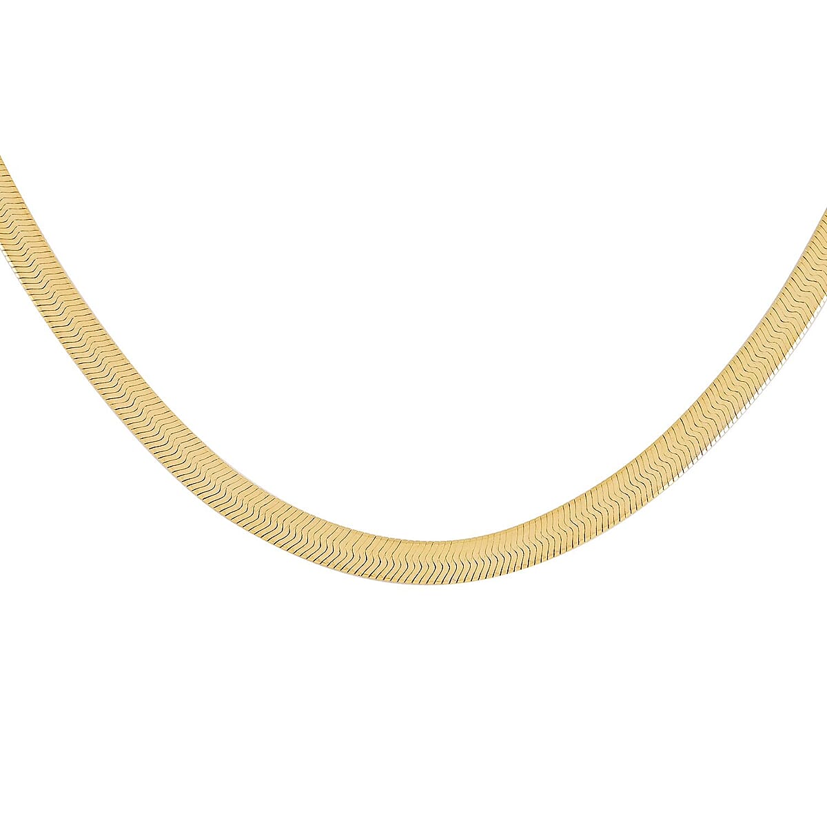 Designed in the herringbone pattern, this elevated flat necklace is to be loved forever. Resembling the skeleton of a fish called a herring, this gold chain consists of small, flat links arranged in a V-shaped pattern. The zig-zag pattern interlocked links are efficiently weaved, making this herringbone necklace gleam with a unique texture. Crafted in 14K yellow gold, this luscious necklace will work with every single attire or accessory in your closet. This herringbone chain necklace is secured by a lobster clasp, ensuring easy to open and fasten around your neckline.