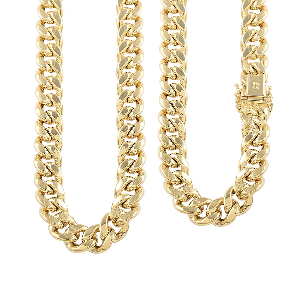 Show your unique personality, taste and elegant design with this Miami Cuban chain necklace. Inspired by Miami's hip-hop culture, this Miami Cuban chain necklace is designed to symbolize luxury and wealth. Show off your flashy style by wearing this big, bold, linked necklace. A variation of the standard cable link chain necklace, the weighty design of a Miami Cuban chain necklace has exceptional flat interlocks appeal that allows this neckpiece to stand out. Fastened with this tab insert enclosure, this 24-inch necklace falls no short in proffering comfortable wearing. Additionally, 14K yellow gold oval links add a touch of robustness to this Miami Cuban chain necklace.