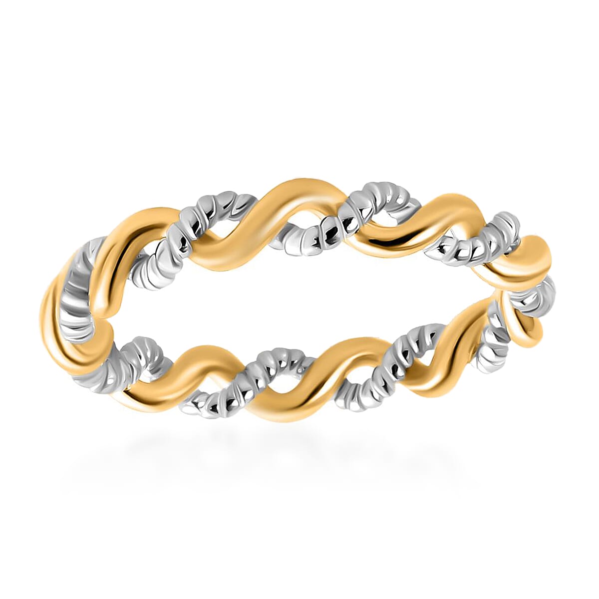 This hypoallergenic ring features a twisted design with a two-tone metal band, combining 14K yellow gold over sterling silver. The intertwined and twisted texture bands create a unique aesthetic on your fingers.