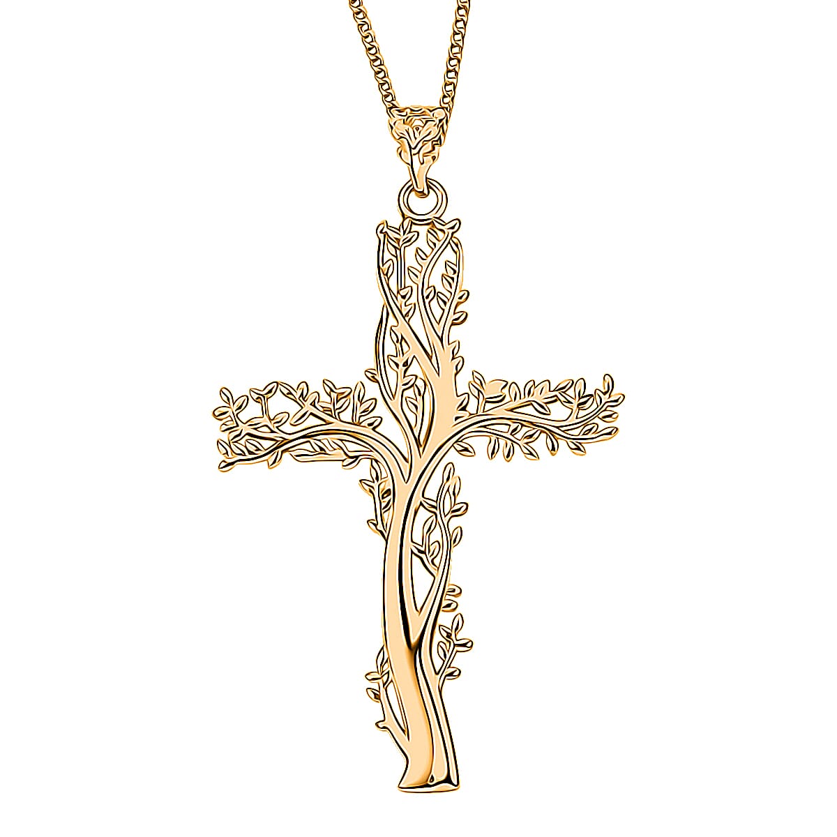 14K YG Over Sterling Silver Tree of Life Cross Pendant with ION Plated YG Stainless Steel Necklace (20 Inches)