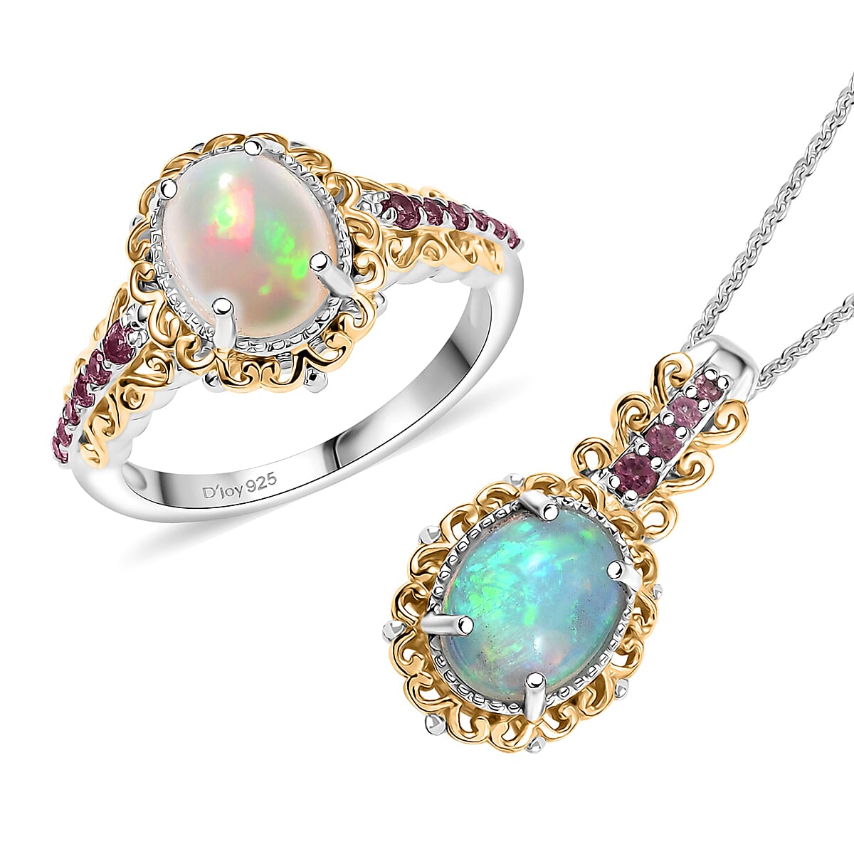 2 Piece Set - D'Joy Premium Ethiopian Welo Opal, Ouro Fino Rubellite 2.65 ctw Victorian Filigree Ring (Size 9.0) and Pendant Necklace 20 Inches in 18K Vermeil YG and Rhodium Over Sterling Silver