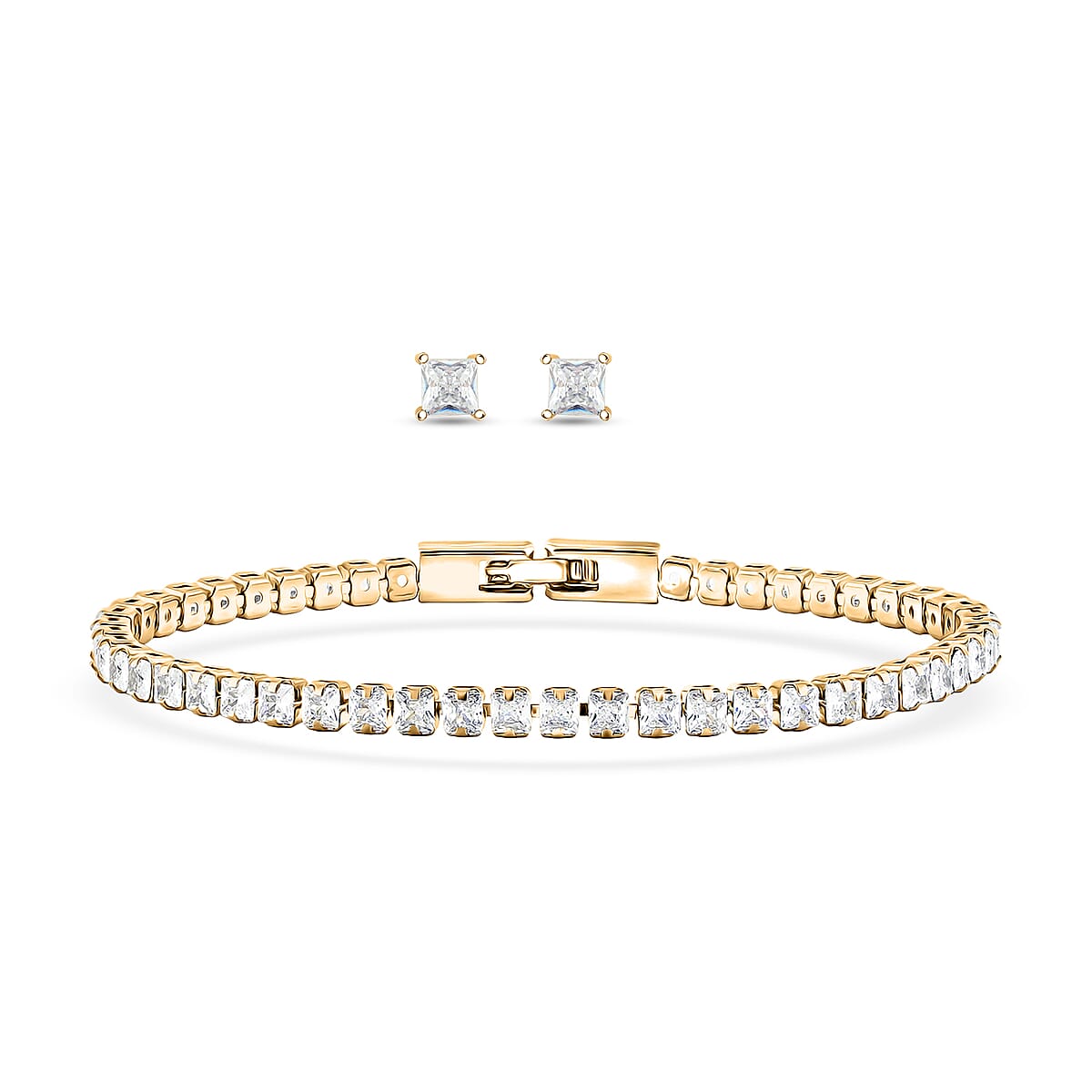 2 Piece Set - Fancy Cut Simulated Diamond 5.60 ctw Tennis Bracel (7.50 In) and Earrings in Goldtone