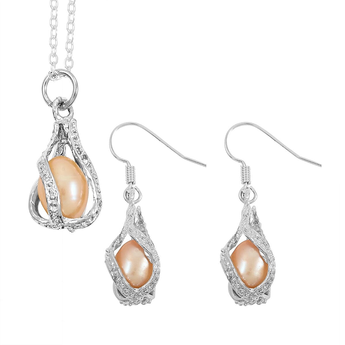 2 Piece Set - Freshwater Pink Pearl Earrings and Pendant Necklace 18 Inches in Silvertone