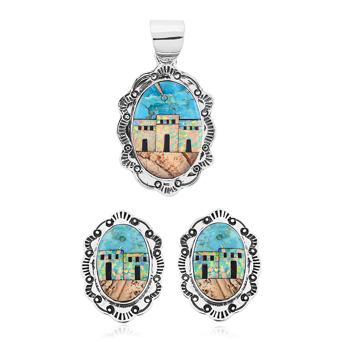 2 Piece Set - Santa Fe Style Kingman Turquoise, Multi Gemstone Pendant without Chain and Earrings in Sterling Silver 5.25 ctw