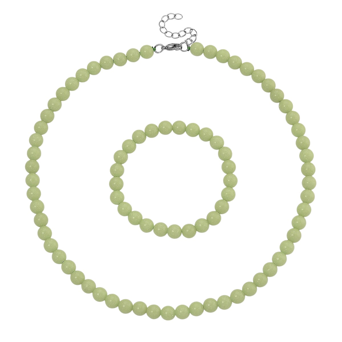 2 Piece Set Green Luminous Glowing in Dark Beaded 210.00 ctw Stretch Bracelet (6.5-7In) and Necklace 18-20 Inches in Stainless Steel