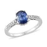 This Tibetan kyanite and Cambodian zircon ring for women elegantly pairs an oval-shaped Tibetan kyanite with round Cambodian zircons on the shank, all encased in durable sterling silver. This silver ring focuses on the kyanite's rich blue hue and the sparkling contrast provided by the zircons.