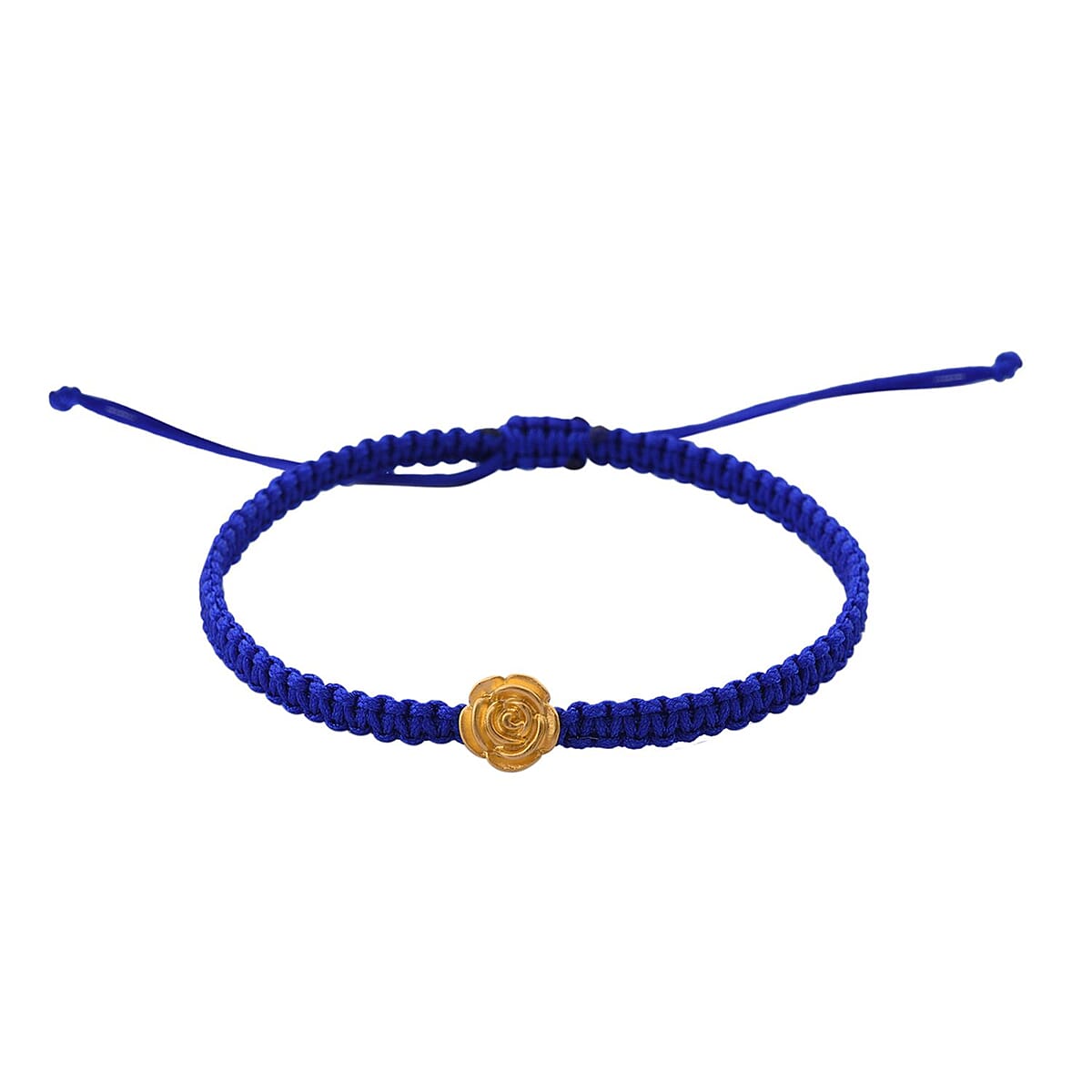 24K Yellow Gold Rose Floral Bracelet in Blue Cord Adjustable