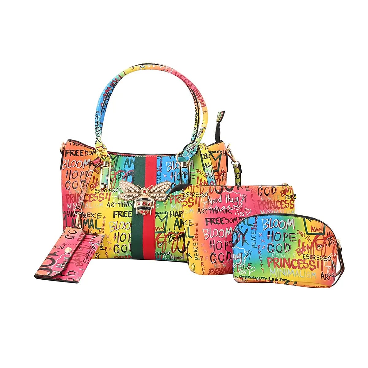 This vegan leather handbag set includes a tote, clutch, cosmetic bag, and coin purse, all showcasing a graffiti pattern. They seamlessly complement one another with a coordinated aesthetic, blending functionality with style. Crafted from vegan leather, these designer bags offer a sustainable and fashion-forward option for any occasion.