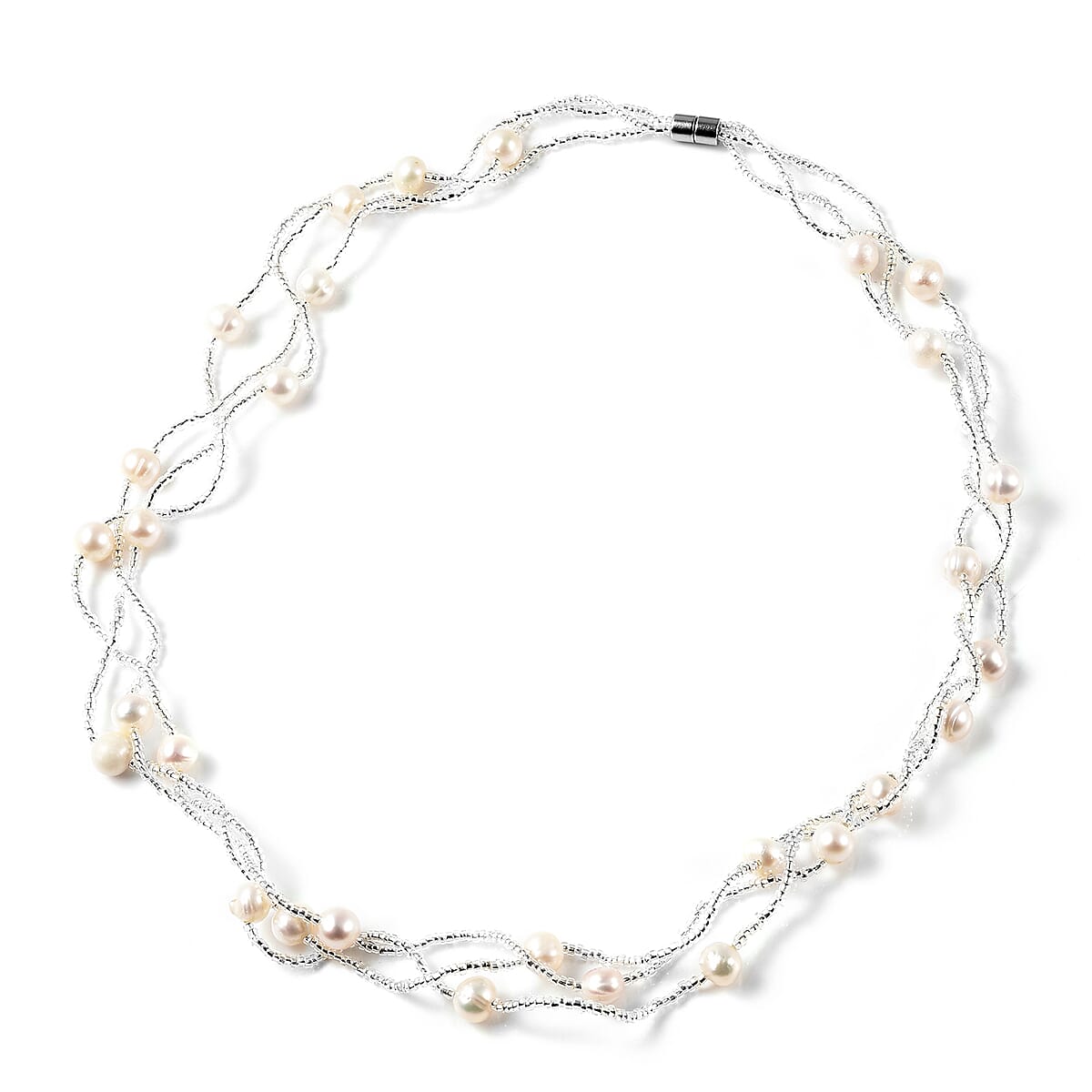 5-7mm White Freshwater Cultured Pearl and Glass Necklace 18 Inches in Silvertone