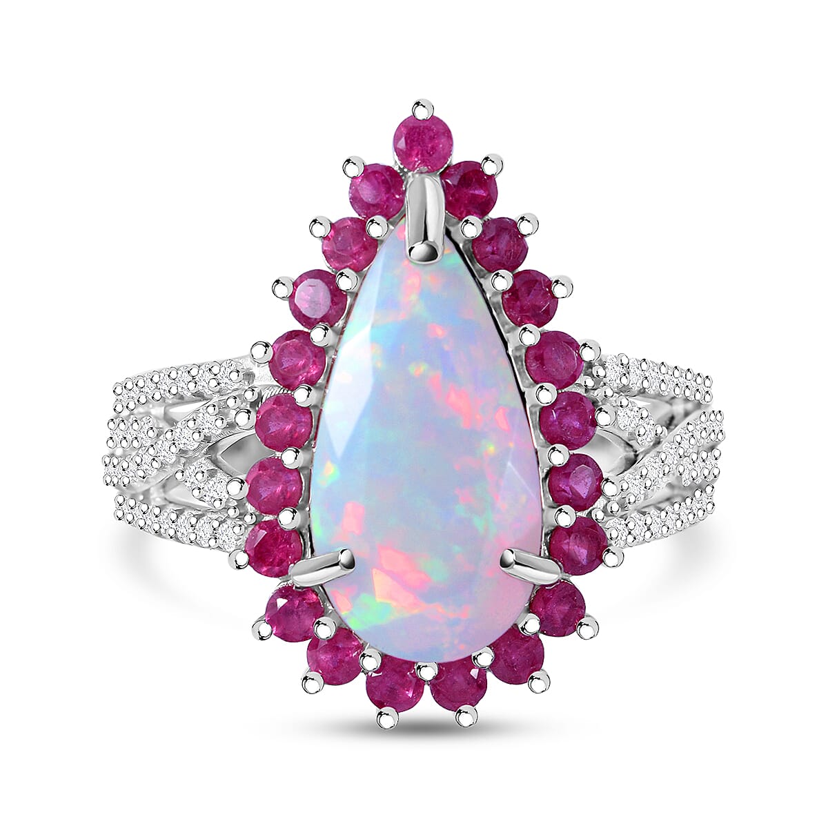 AAA Ethiopian Welo Opal, Niassa Ruby (FF) and White Zircon 4.00 ctw Halo Ring in Rhodium Over Sterling Silver (Size 6.0)