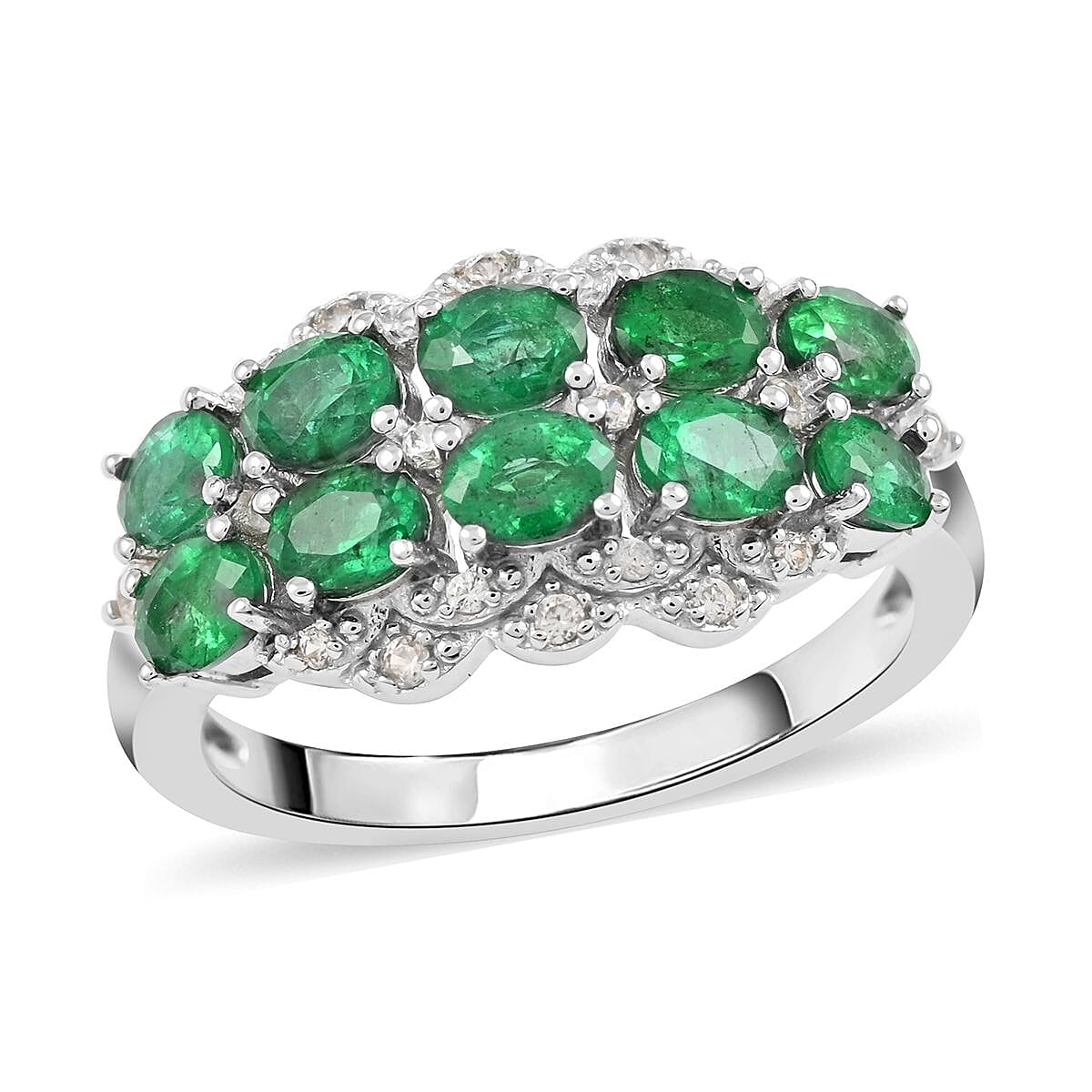 AAA Kagem Emerald and Natural White Zircon Ring in Rhodium Over Sterling Silver (Size 10.0) 1.90 ctw
