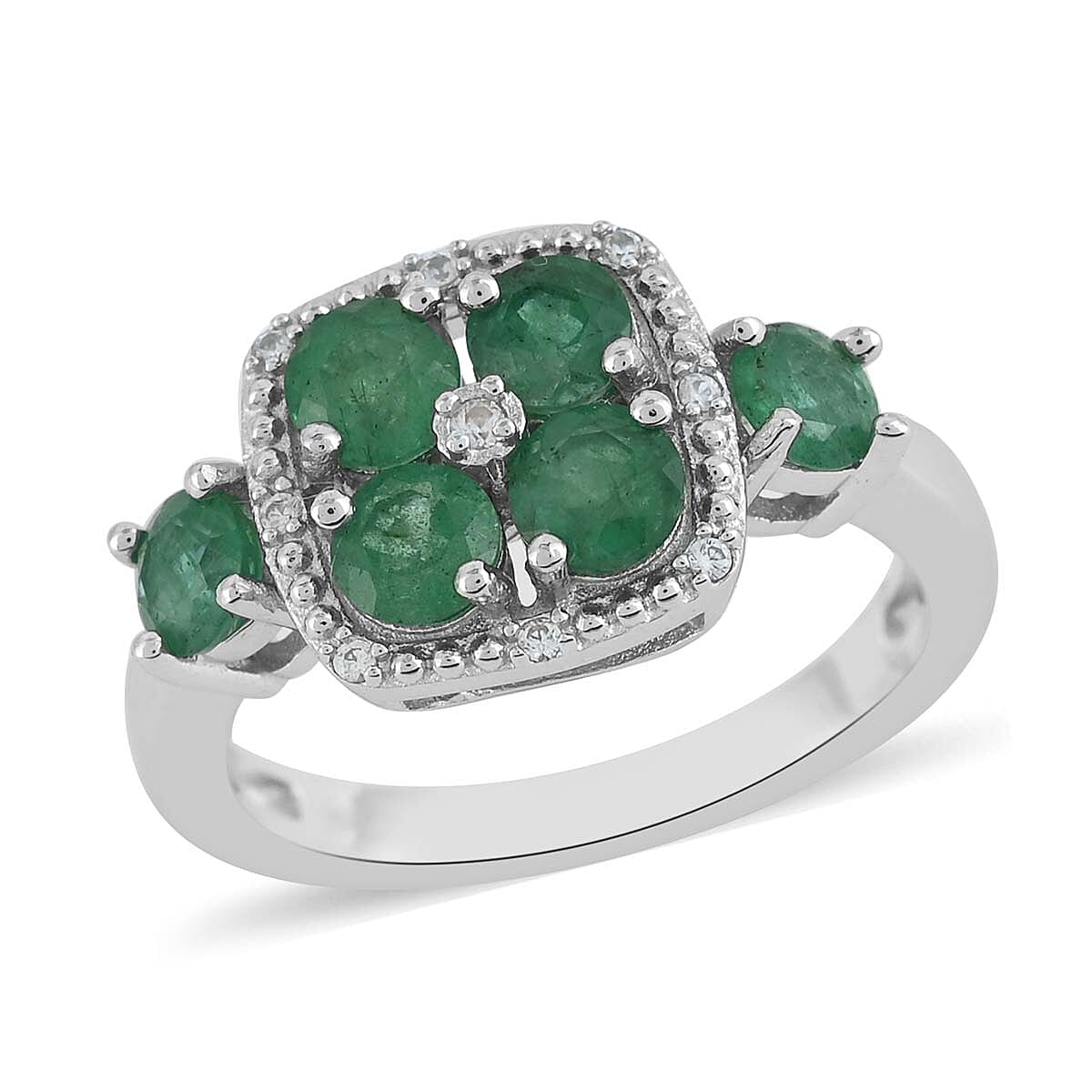 AAA Kagem Emerald and Natural White Zircon Ring in Rhodium Over Sterling Silver (Size 6.0) 1.60 ctw