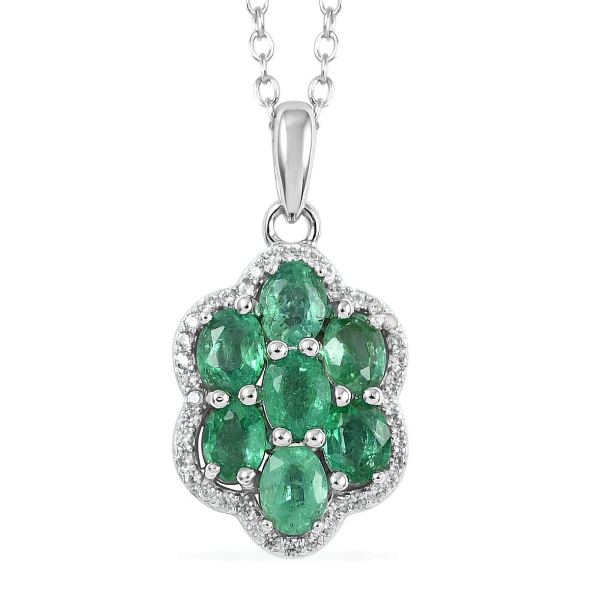 AAA Kagem Emerald and White Zircon Flower Pendant Necklace 18-19.50 Inches in Rhodium Over Sterling Silver 1.35 ctw