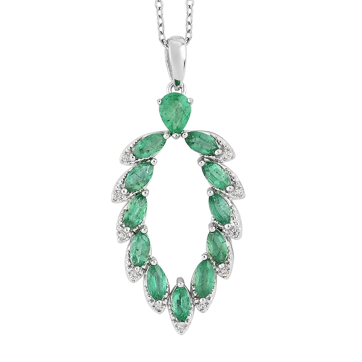 Leaf-inspired, AAA Kagem Zambian Intense green emerald and zircon marquise pendant necklace feature luscious green and silver hues. This pendant's marquise shape is outlined with an array of marquise-shaped AAA Kagem Zambian Intense green emerald set in a visible prong setting. The pendant frame features milgrain metalwork adornment and zircon studs. Milgrain and visible prong locks create a gleaming silver beaded embellishment. This rhodium-plated sterling silver pendant is accompanied by an 18inches princess-length chain.