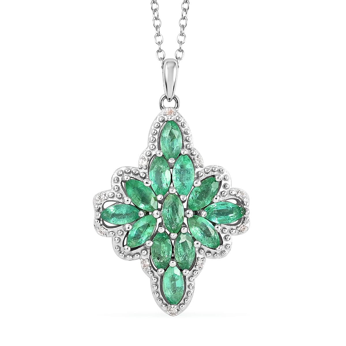 AAA Kagem Emerald and White Zircon Pendant Necklace 18-19.50 Inches in Rhodium Over Sterling Silver 1.60 ctw