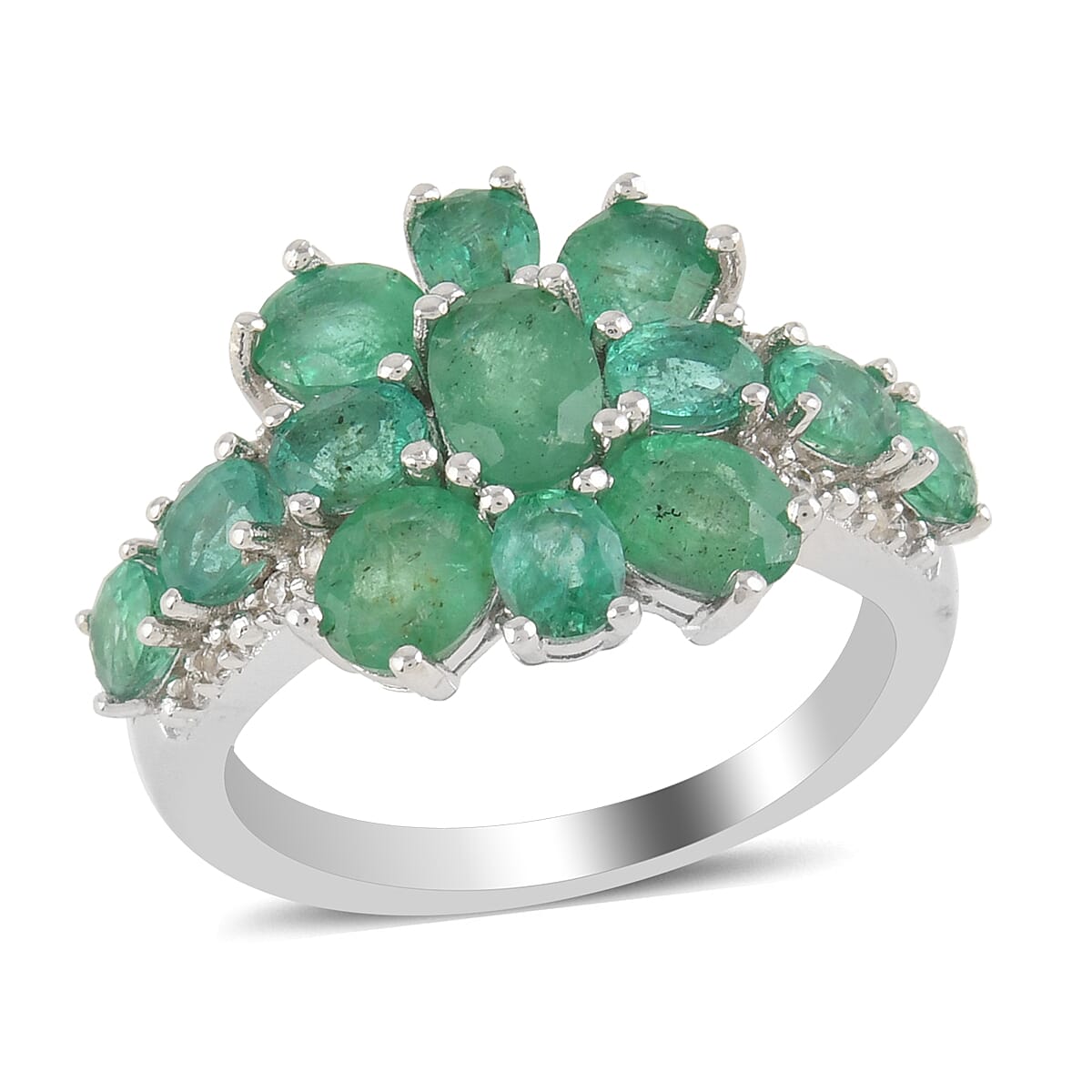 AAA Kagem Emerald and White Zircon Ring in Rhodium Over Sterling Silver (Size 7.0) 3.15 ctw
