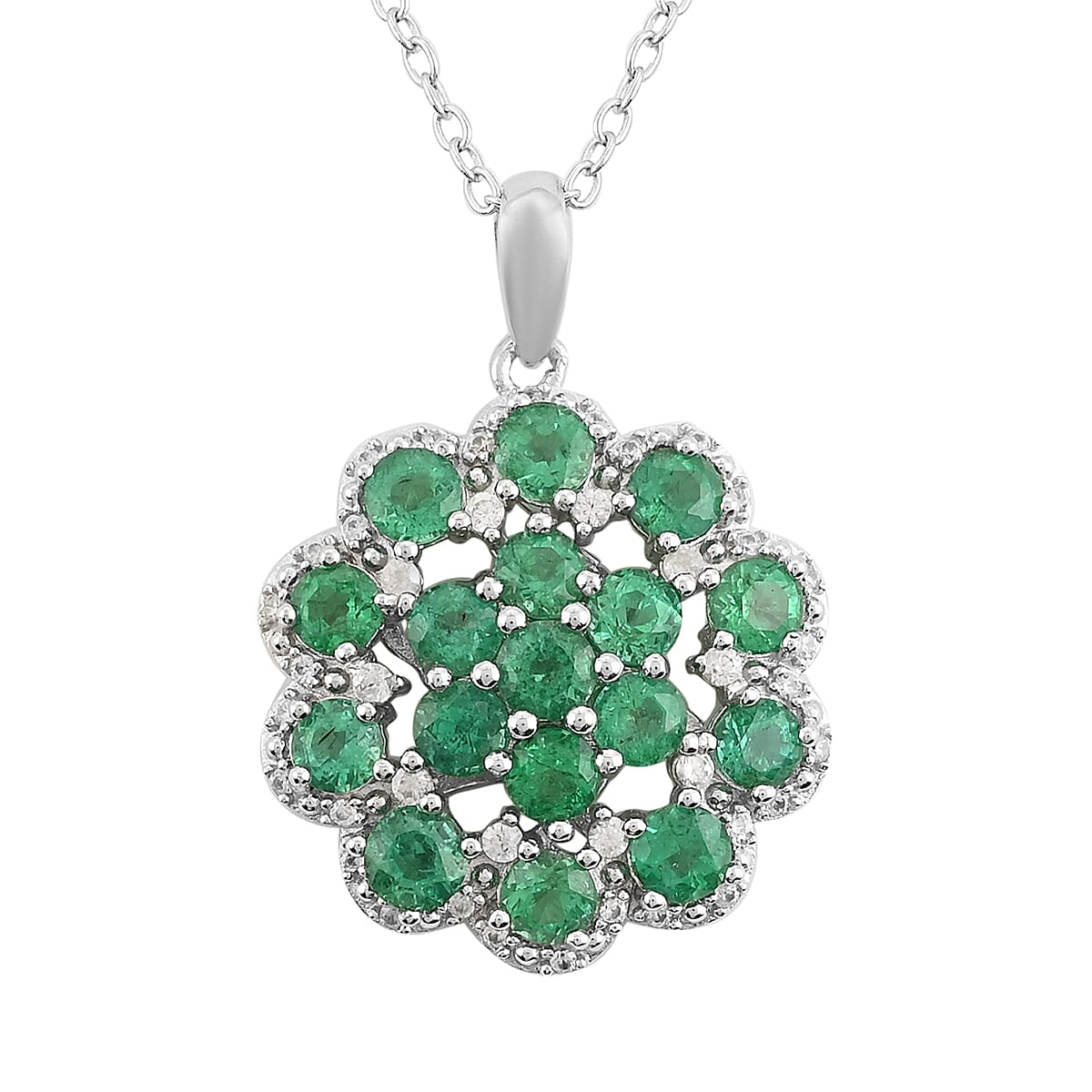 AAA Kagem Emerald and White Zircon Round Pendant Necklace 18 Inches in Sterling Silver 3.45 ctw