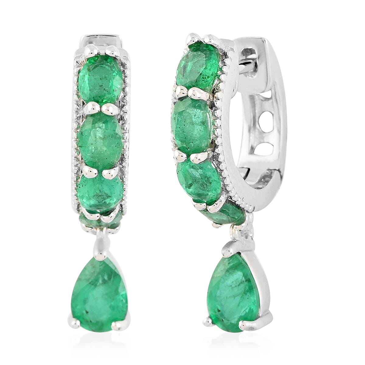 AAA Kagem Emerald Hoop Earrings with Dangle Charm in Rhodium Over Sterling Silver 2.15 ctw