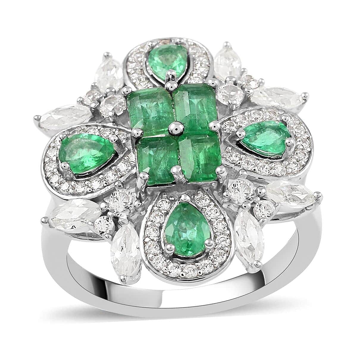 AAA Kagem Zambian Intense Green Emerald and Natural White Zircon Ring in Rhodium Over Sterling Silver 3.00 ctw