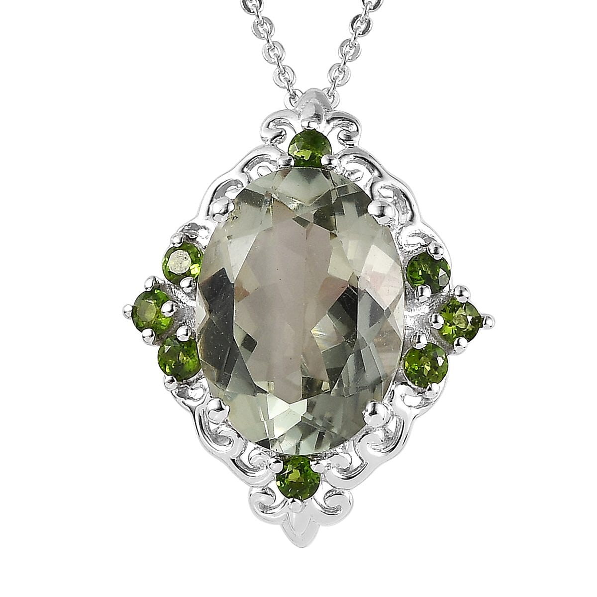 Crafted to enhance your attire and make a powerful style statement this AAA Montezuma Prasiolite and Natural Chrome Diopside pendant necklace features oval-shaped Montezuma Prasiolite in the center of the scrollwork frame with diopside accents. This Montezuma Prasiolite pendant necklace showcases an amazing blend of color and sparkles to put you in the spotlight. Set in platinum-plated sterling silver, this necklace features a lobster clasp to keep it securely on your neck.