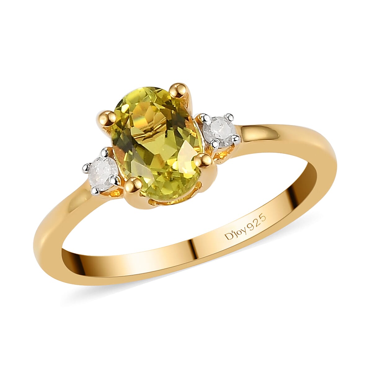 Classy yet trendy, this AAA natural Tanzanian canary tourmaline ring is highlighted by the diamonds. The oval-shaped gem is highlighted by the round-shaped diamonds on both sides of the bright yellow gemstones, adding a shimmering appeal. Crafted in yellow gold vermeil over sterling silver, this premium ring is a royal piece of jewel. With the strategic assortment of gems on the smooth lustrous shank, this premium tourmaline ring gives a luxurious symmetric touch to your hand gestures. The colors of canary tourmaline can range from a pale yellow to deep golden, but the most valuable are the bright yellows, usually with just a touch of green.