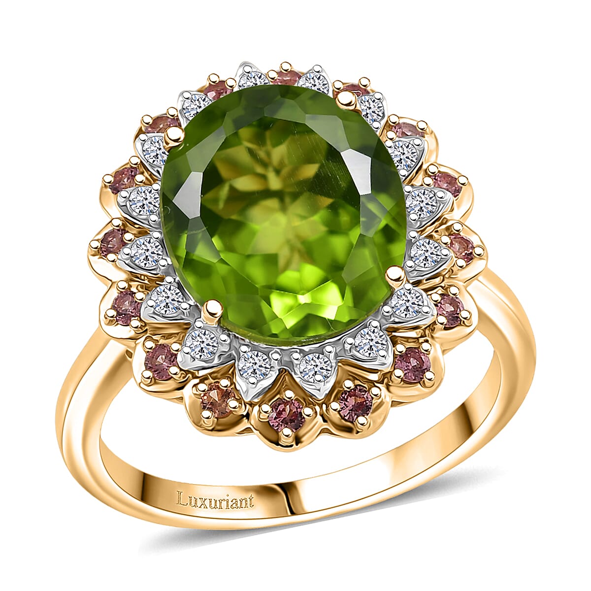 AAA Peridot, Padparadscha Sapphire and G-H SI Luxuriant Lab Grown Diamond 6.03 ctw Ring in 10K Yellow Gold (Size 9.0)