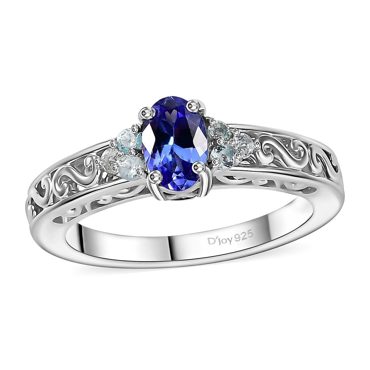 This AAA tanzanite and Betroka blue apatite ring gracefully presents an oval AAA tanzanite, renowned for its deep violet-blue shade, enhanced by the vibrant contrast of round Betroka blue apatite. Inspired by the Victorian era, the design conveys wealth and strength through its intricate scrollwork on bail, making it a piece of jewelry and a symbol of enduring elegance.