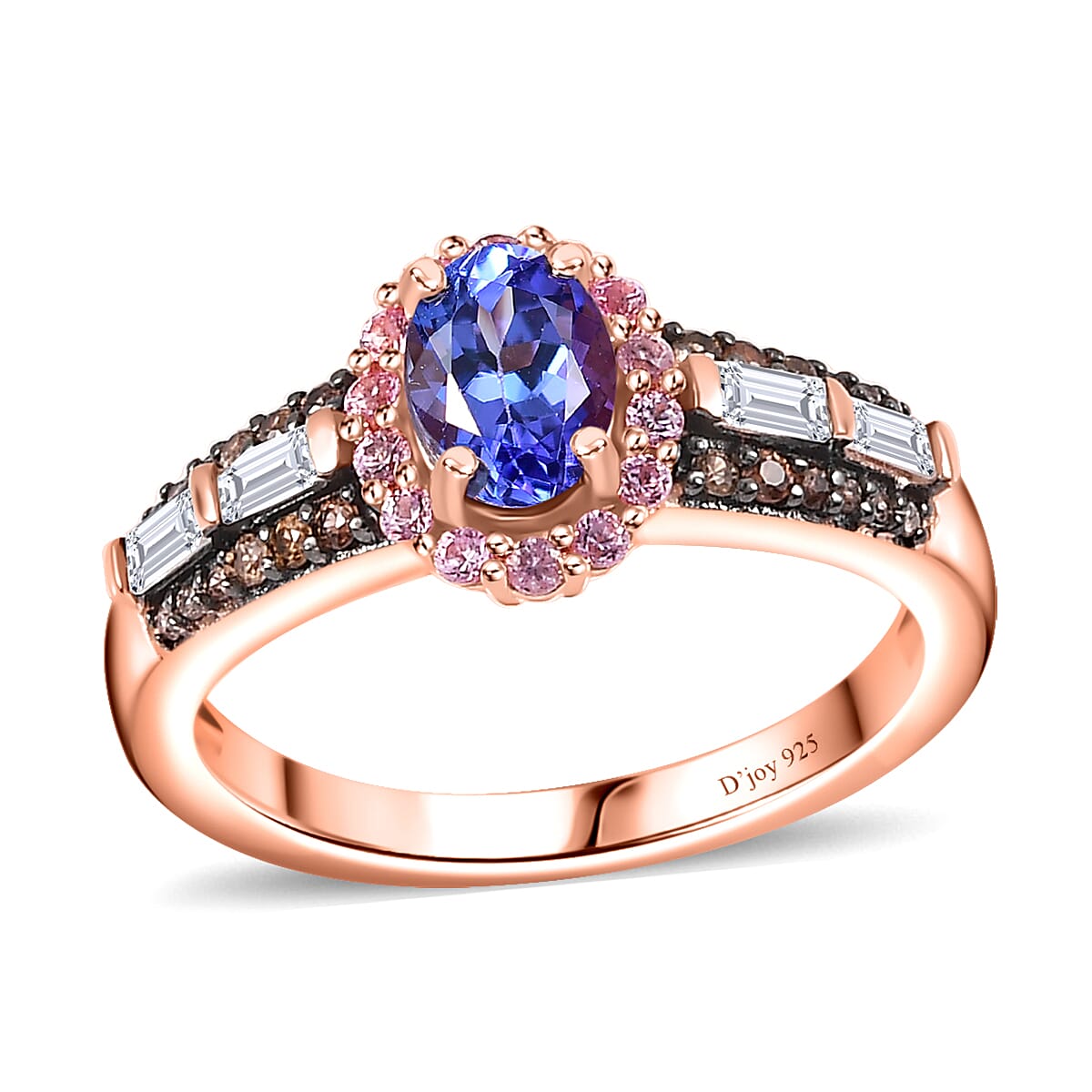 Imbue elegance into your ensemble with this AAA tanzanite and multi gemstone ring. Crafted in 18K vermeil rose gold over sterling silver, this tanzanite ring features a prong-set tanzanite at its center, encircled by a halo of pink gemstones. The shank is adorned with multi gemstones, creating a captivating piece that exudes sparkle and charm.