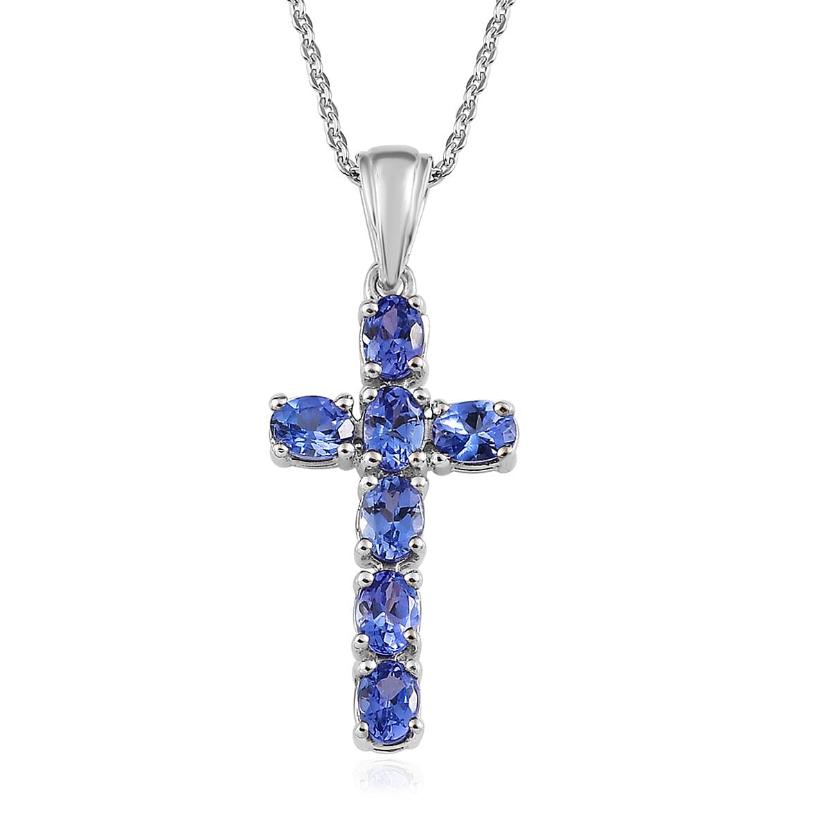 Surprise all the onlookers with the spiritual charm of this AAA tanzanite cross pendant necklace. This necklace features a tanzanite studded cross symbol pendant, exemplifying excellent delineation of contemporary jewelry designs. Inspired by the religious cross sign, this cross pendant necklace symbolizes faith in Christianity. This pendant flaunts luscious blue oval-shaped tanzanite accents all over. The cross pendant is believed to protect its wearer from harm, bring calm and peace, and ward off evil spirits. Wearing a pendant featuring a cross is a symbol of faith, represents that person's beliefs, provides comfort, and promotes awareness. This 20-inch matinee necklace features sparkling brilliance. Crafted in platinum-plated sterling silver, this jewelry piece will make you sparkle for the right reason. This variety of tanzanite is classified as featuring intensely saturated violetish blue, accompanied by flashes of deep red.