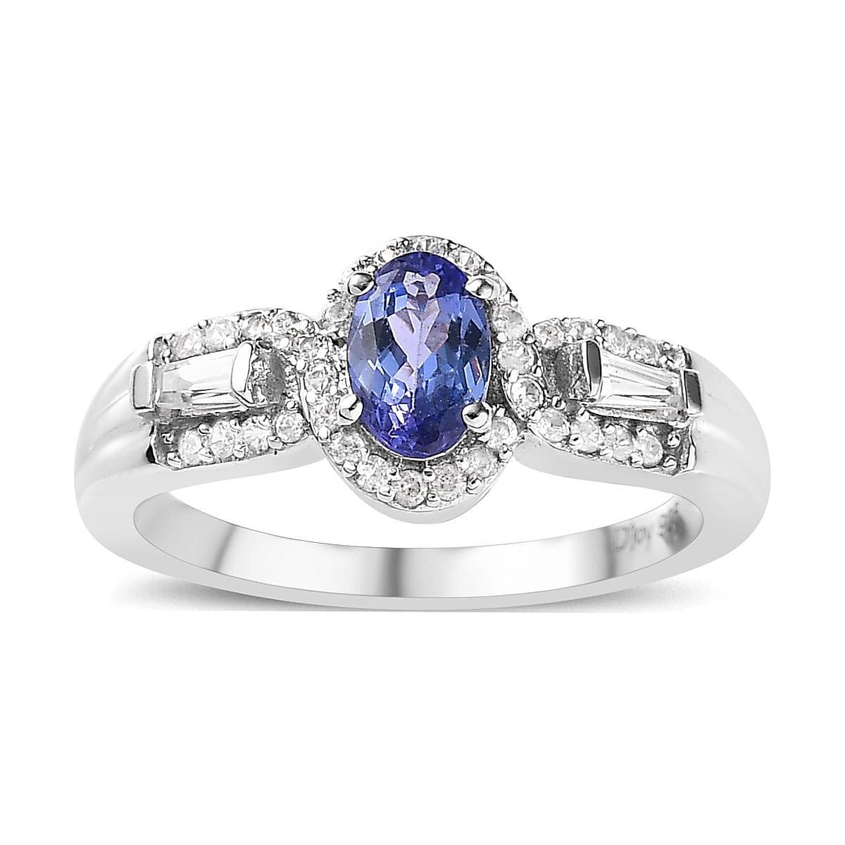 AAA Tanzanite, White Zircon Halo Ring in Platinum Over Sterling Silver (Size 10.0) 0.90 ctw