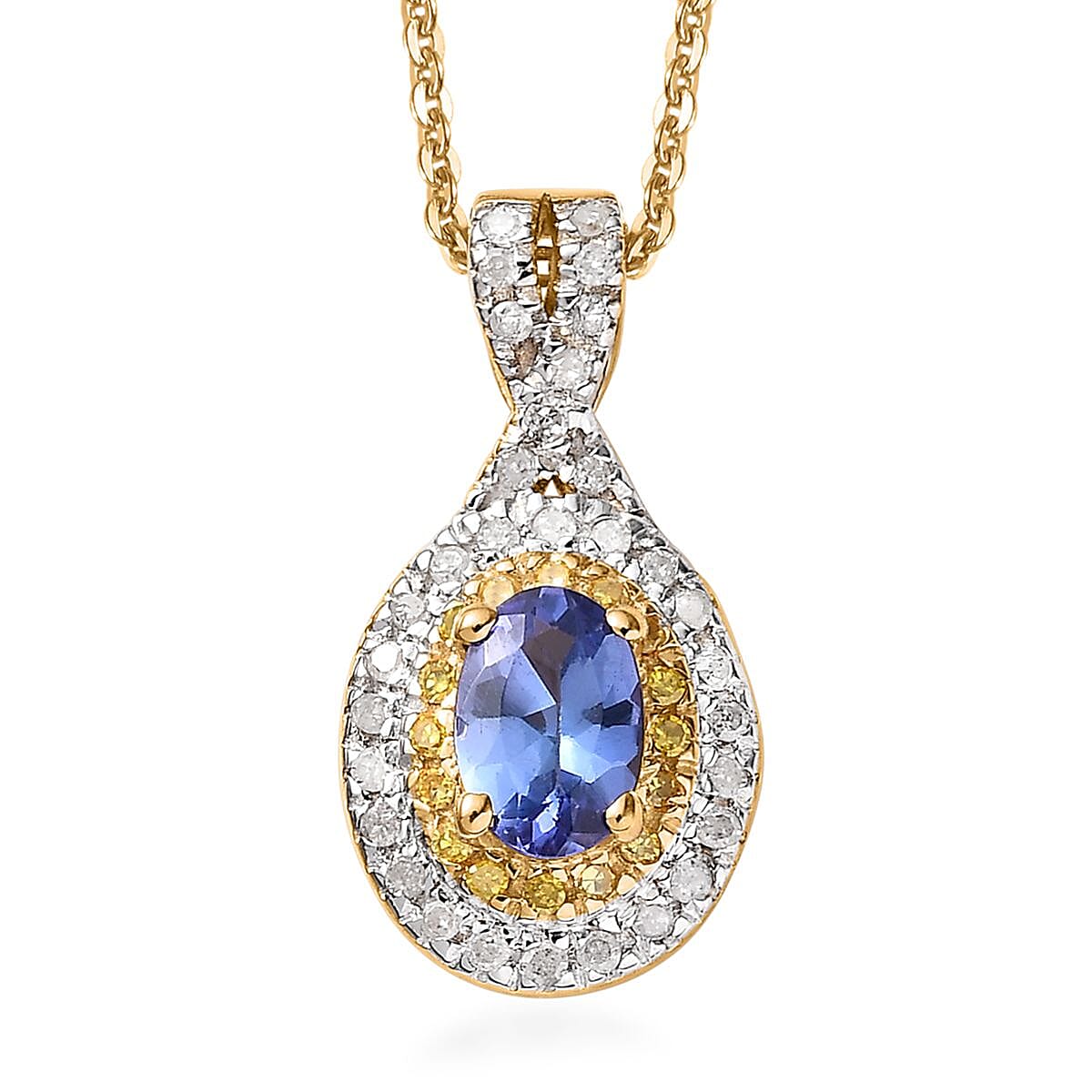 AAA Tanzanite, Yellow and White Diamond Double Halo Pendant Necklace 20 Inches in Vermeil Yellow Gold Over Sterling Silver 0.65 ctw