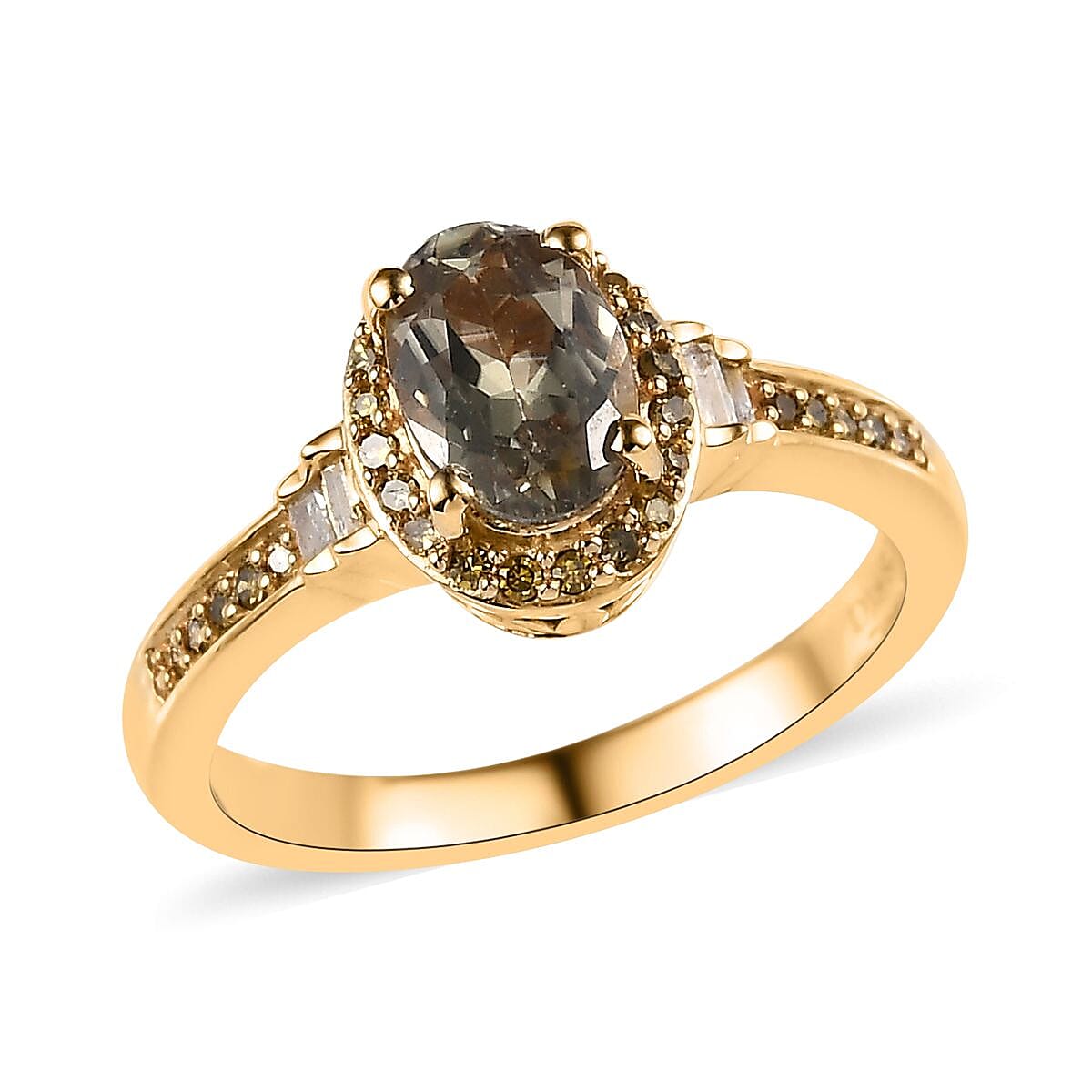 Step into the realm of extraordinary elegance with our AAA turkizite ring. Showcasing a premium turkizite encircled by a halo of white and yellow diamonds, this piece embodies celestial charm. With a staircase of diamond baguettes and a yellow diamond-encrusted shank set in vermeil yellow gold over sterling silver, it's an awe-inspiring fusion of artistry and rarity.