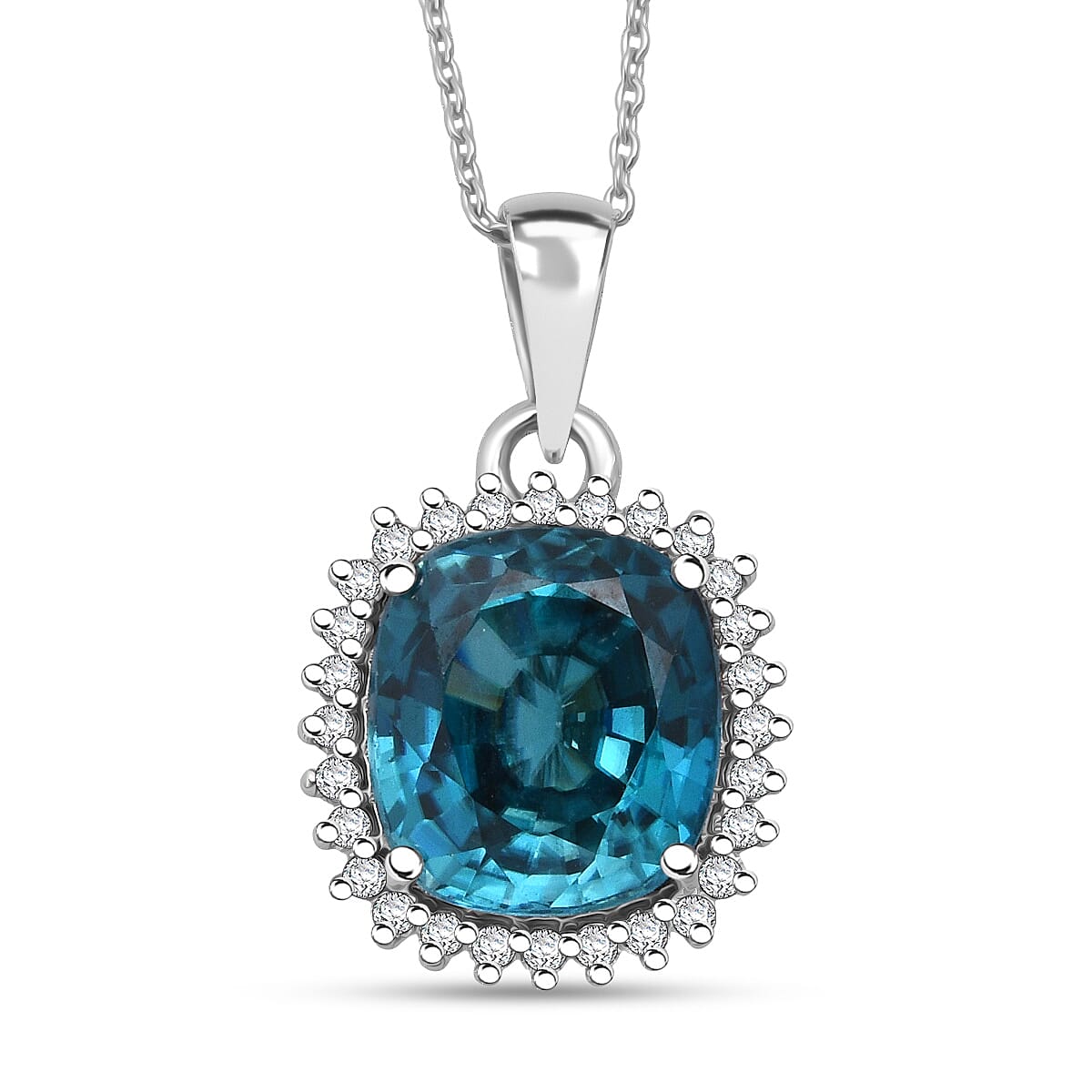 AAAA Cambodian Blue Zircon and Luxuriant Lab Grown Diamond E-F VS 5.10 ctw Aura Pendant Necklace in 10K White Gold 18 Inches