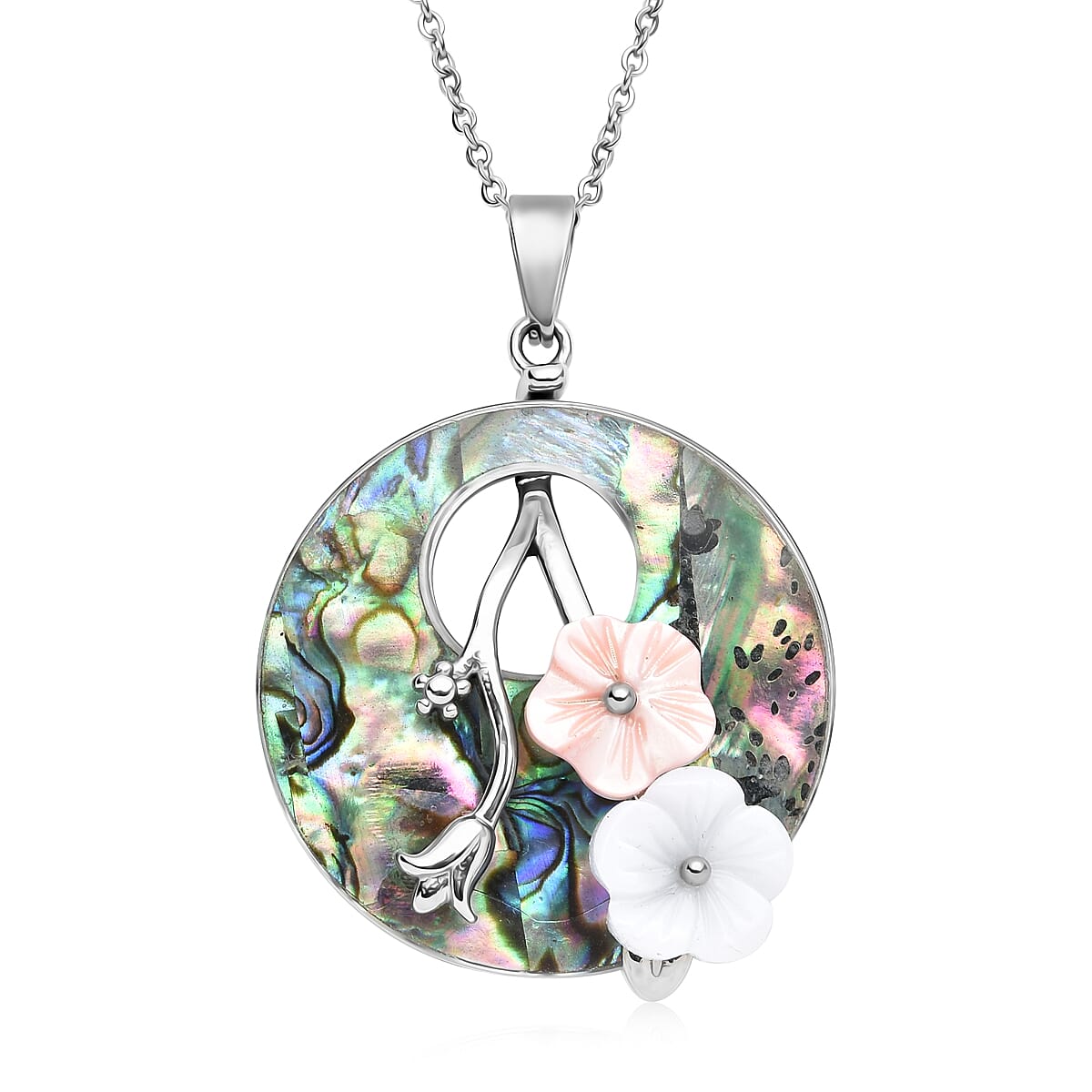 Abalone Shell, Pink Shell Pearl and Resin Flower Pendant Necklace 20 Inches in Stainless Steel