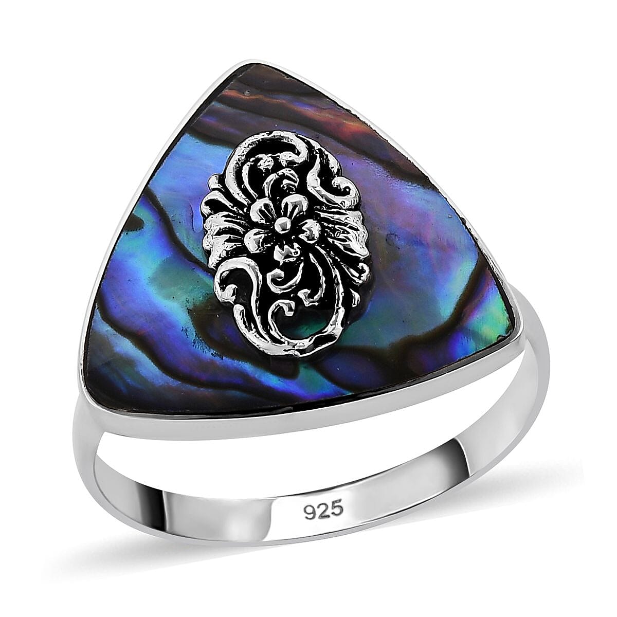 Indulge in the captivating allure of our abalone shell solitaire ring. This exquisite solitaire ring showcases a fancy-shaped abalone shell gemstone, held securely by bezel settings. The intricate metal work features a mesmerizing floral design, adding an extra touch of enchantment. Crafted from sterling silver, this women's ring exudes a timeless charm and brings the beauty of the ocean to your fingertips.