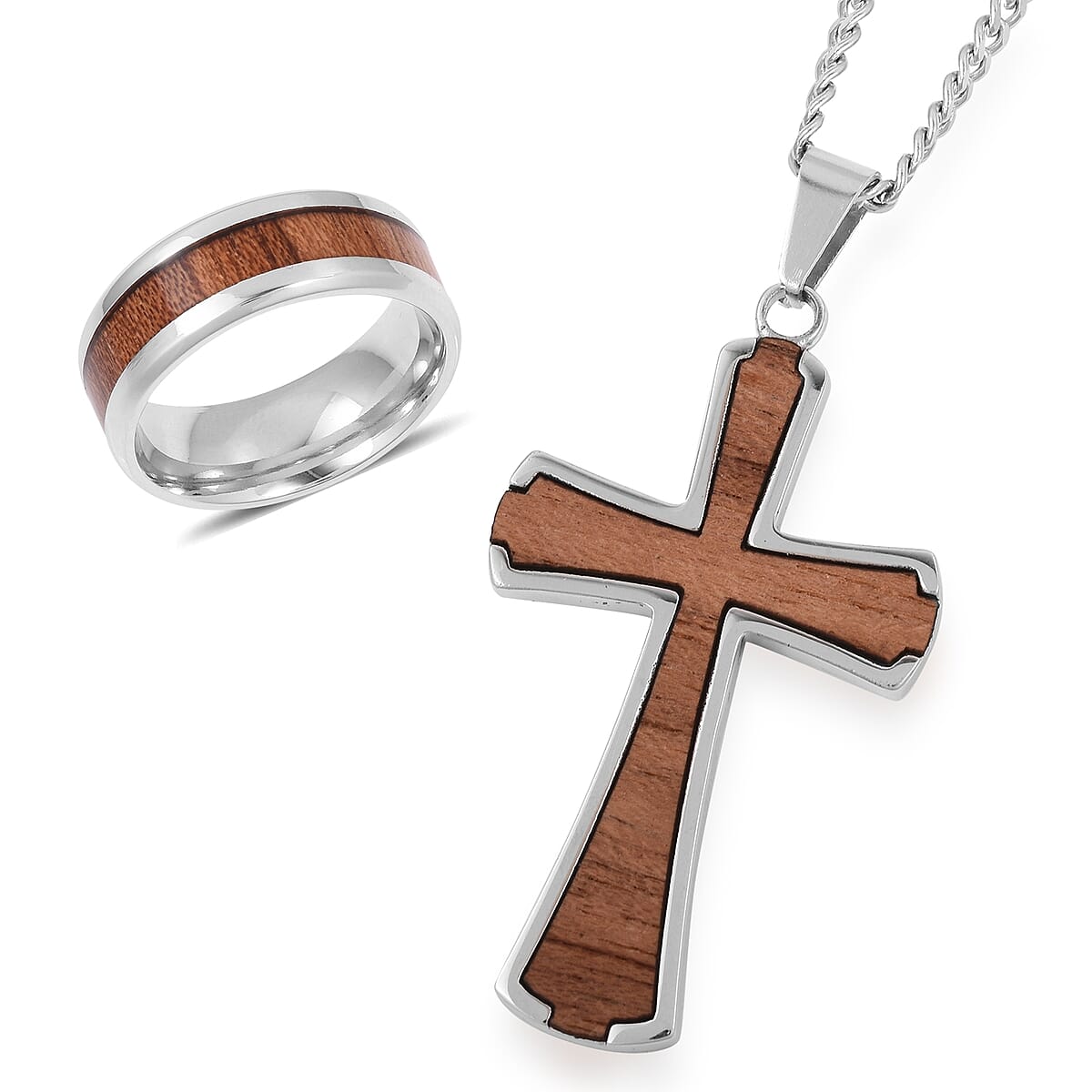 Acacia Wood Enameled Stainless Steel Men's Ring and Cross Pendant With Chain (24 in)
