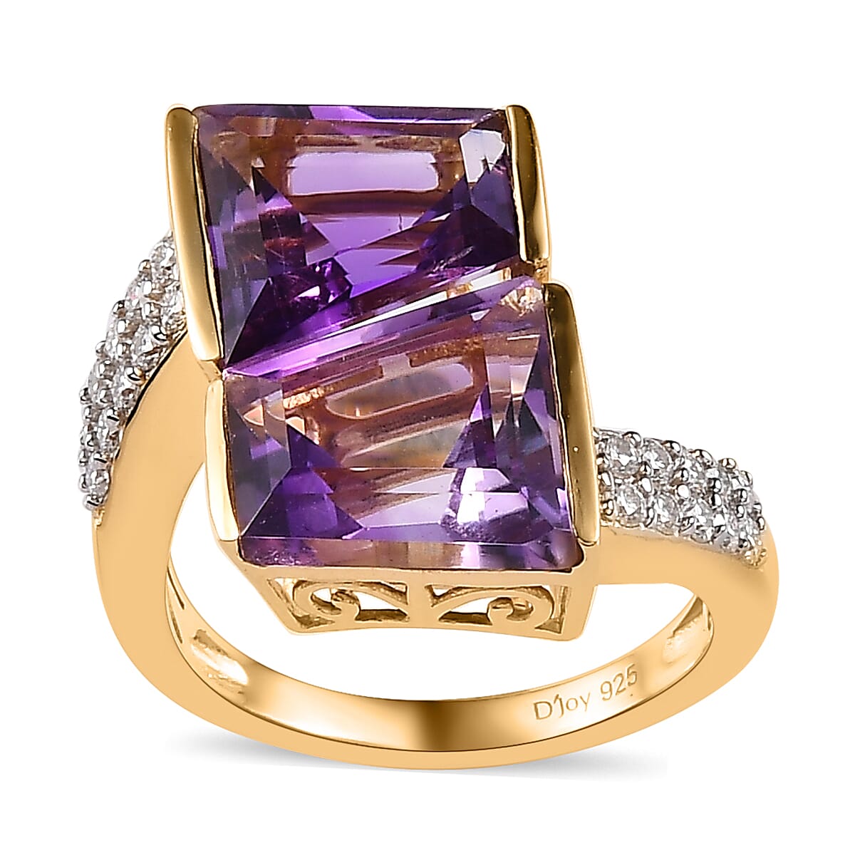 Slip into a world of mystique with our African amethyst cocktail ring for women, artistically crafted with a captivating snake design. The bypass ring structure houses geometric-shaped amethysts, expertly set by four prongs. As the snake slithers around your finger, a shank gleaming with dual rows of moissanites elevates the allure. Enveloped in vermeil yellow gold over sterling silver, this is more than a ring—it's an enchantment.